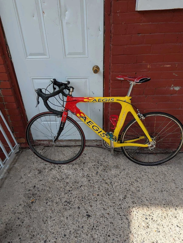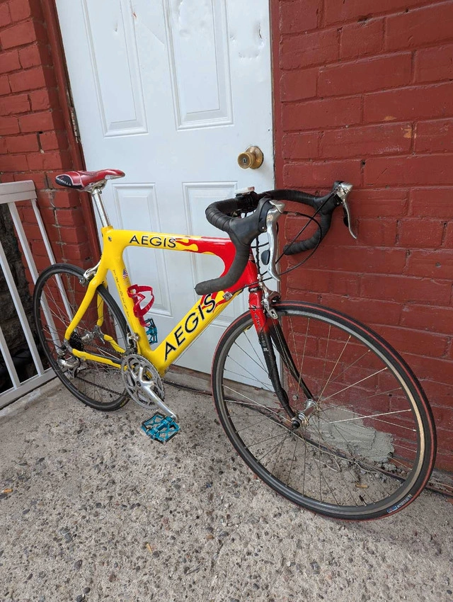 52cm carbon fiber road/triathlon bike with full Shimano 105 components and Chris King headset. This model is notable for its carbon fiber construction and association with the early 2000s era of advanced bicycle manufacturing. The frame is made of full carbon fiber, often handcrafted in the USA, and known for its combination of stiffness and compliance. Aegis was one of the early U.S. companies to manufacture full carbon frames, and the Trident model is often considered a vintage or classic in the world of high-performance cycling. Aegis is no longer in business, meaning these bikes are sought after by collectors or enthusiasts looking for a piece of cycling history.