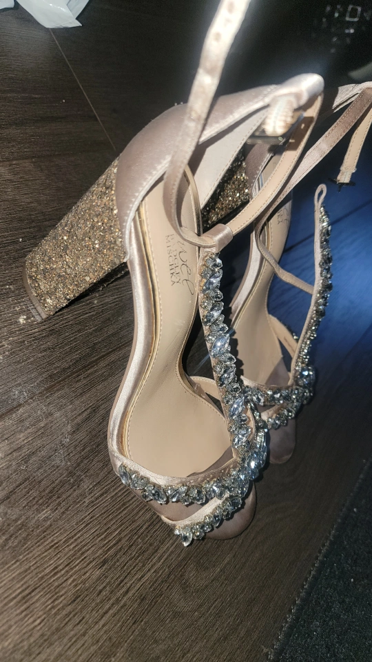 Selling a pair of beautiful Jewel Badgley Mischka heels (nude/blush colour) in size 6.5. They feature a glittery gold block heel and a t-strap design with clear rhinestones. Perfect for a night out or a special occasion!
