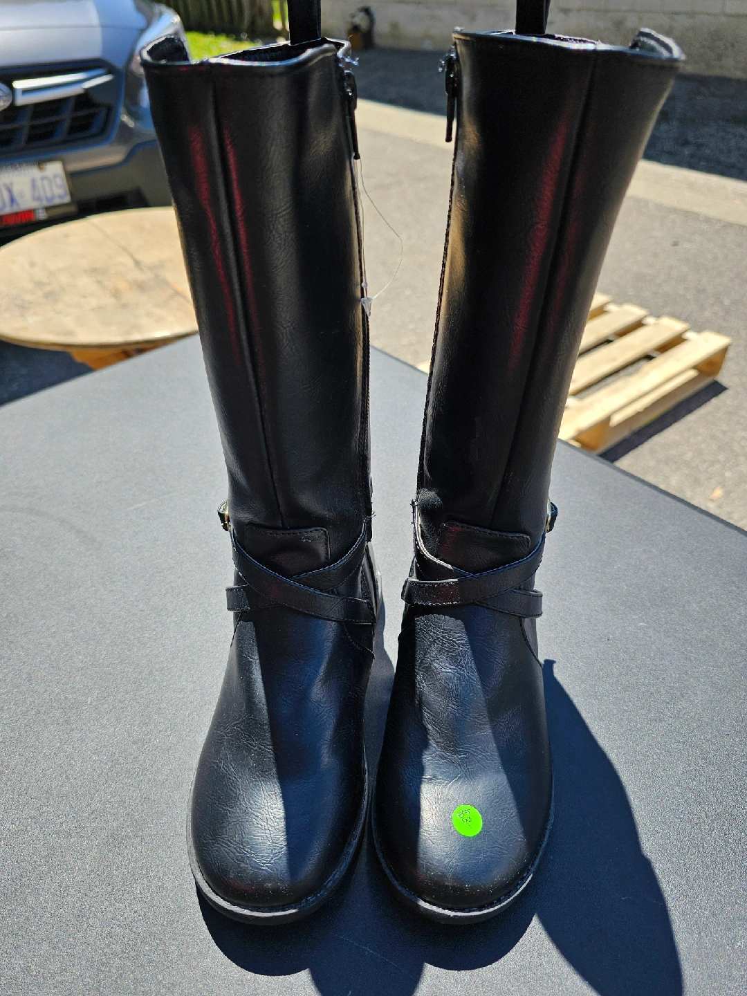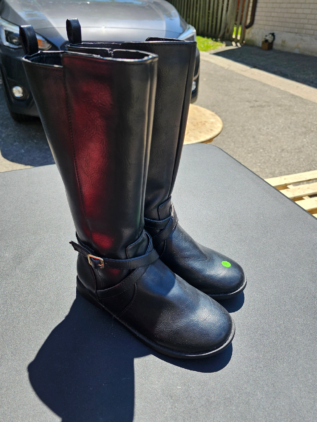 Selling a pair of black riding boots in great condition! They feature a strap and buckle detail around the ankle and a zipper closure. Perfect for fall and winter