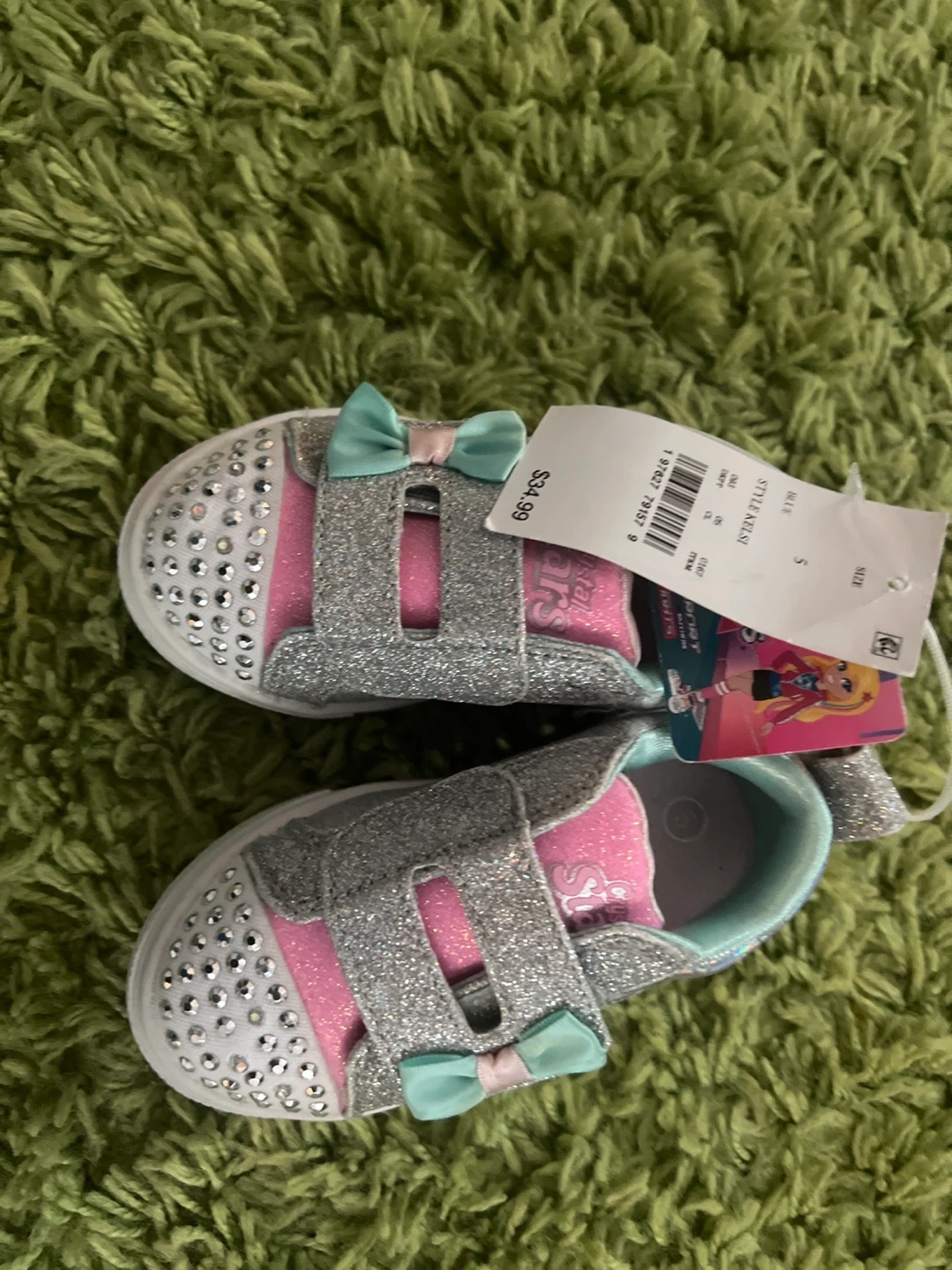 These Skechers Crystal Stars light-up shoes are brand new with tags! They're a size 9 toddler and feature a fun, sparkly design with a cute bow. The lights in the soles make them extra special for your little one!
