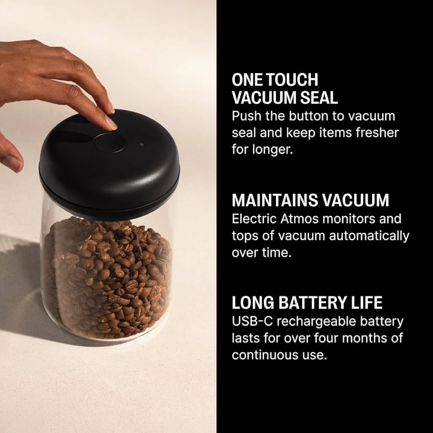 Keep your coffee, snacks, and treats fresher for longer with this Fellow Electric Atmos vacuum canister! It holds 0.7 liters and features: - One-touch vacuum seal - Automatic vacuum maintenance - USB-C rechargeable battery The canister is made of clear glass with a BPA-free plastic lid, and it has an LED status indicator. Includes the original box!
