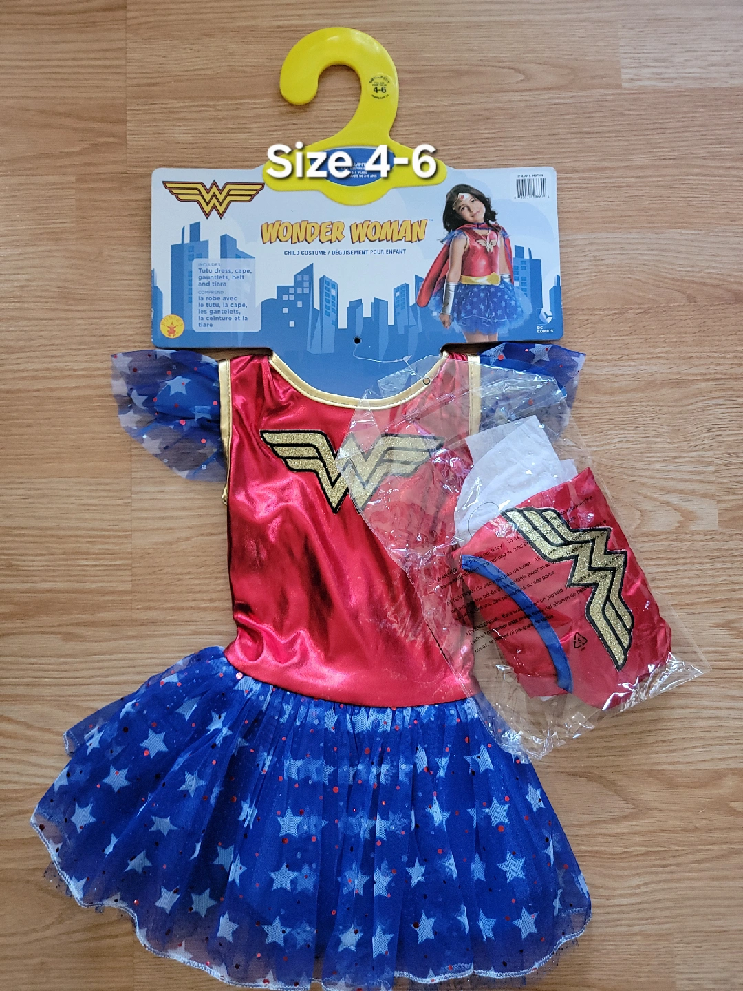 Get your little one ready to save the day with this adorable Wonder Woman costume! This set includes the tutu dress, cape, gauntlets, belt, and tiara. Perfect for dress-up or Halloween!