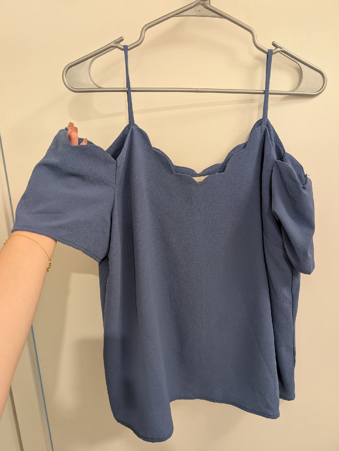 Selling a cute blue crop shoulder top! It's in great condition and ready for a new home. The colour is a lovely, soft blue, perfect for spring or summer days. It's a stylish and comfortable piece to add to your wardrobe