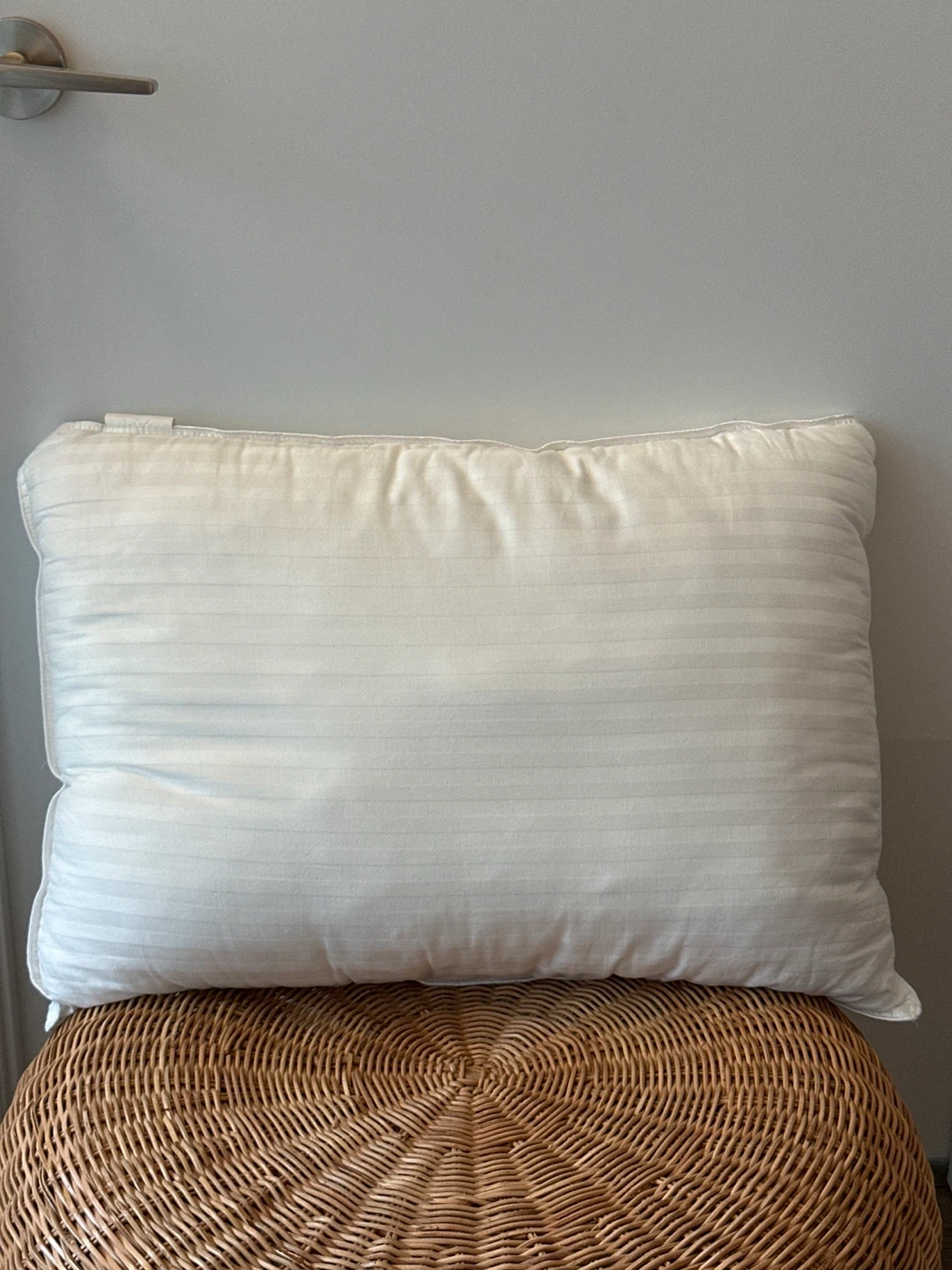 A comfy white pillow with a subtle striped pattern, perfect for adding a touch of simple elegance to your bedroom or living space! It's in great shape and ready for a new home