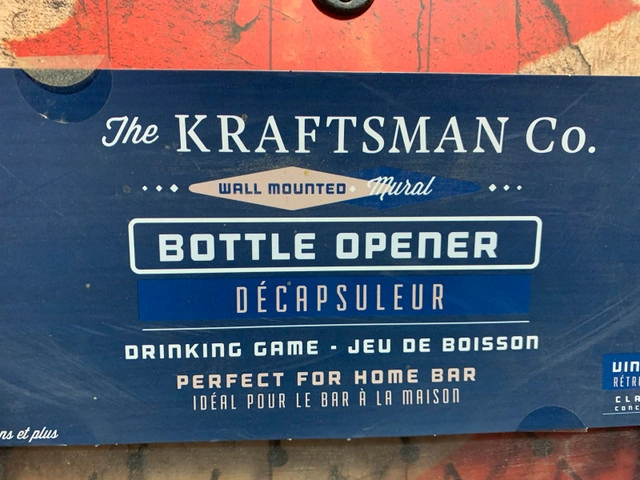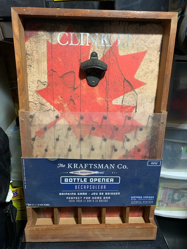 The Kraftsman Co.'s wall-mounted bottle opener and drinking game, featuring a charming Canadian mural! It's the perfect addition for fun-filled evenings. Key Features: * Wall-mounted design for easy installation * Includes a bottle opener and catch box * Features a delightful Canadian mural design * Ideal for home bars or entertainment. This is in excellent condition, ready to bring joy and entertainment to your gatherings. Similar items on Kijiji range from $30 to $60.