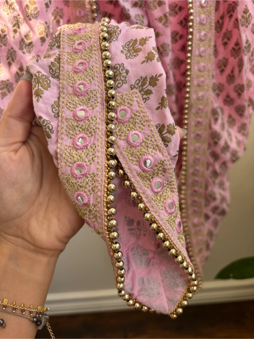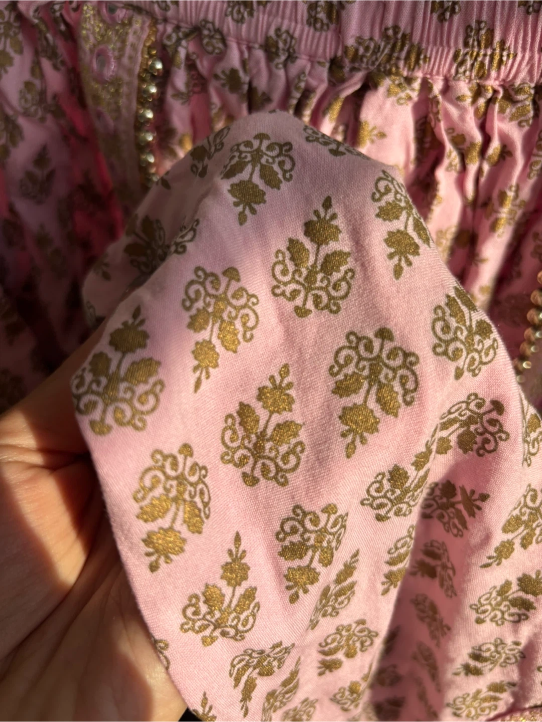 135Genie pants 🧞♀️These are a pair of Priya Fab pants in a free size. They're pink with a gold pattern and some decorative embellishments. They're in great condition and originally purchased for $90.00.