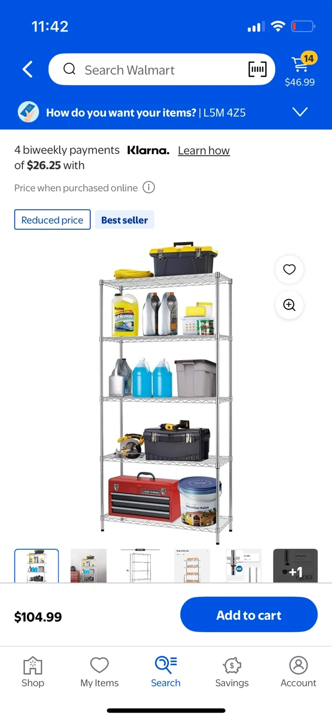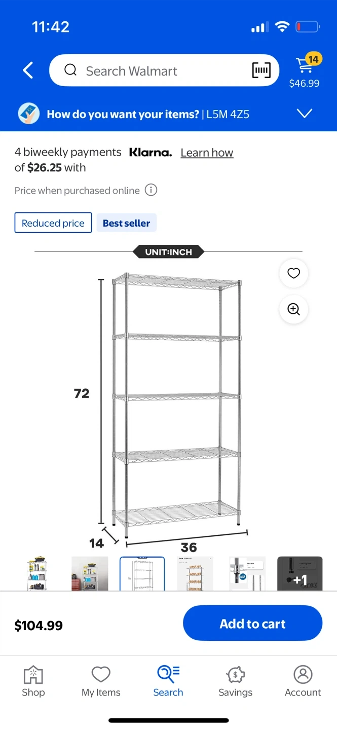 122Selling a metal wire shelf rack with 5 tiers. It's great for storage and organization. Dimensions: - Height: 72 inches - Width: 36 inches - Depth: 14 inches Originally bought for $104.99 at Walmart