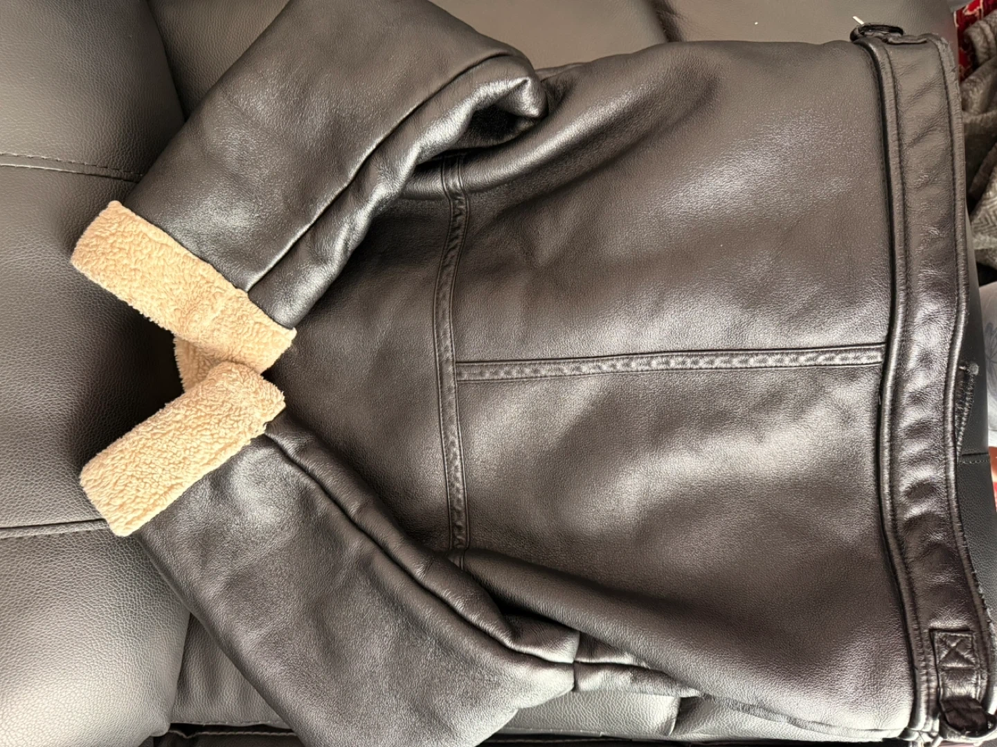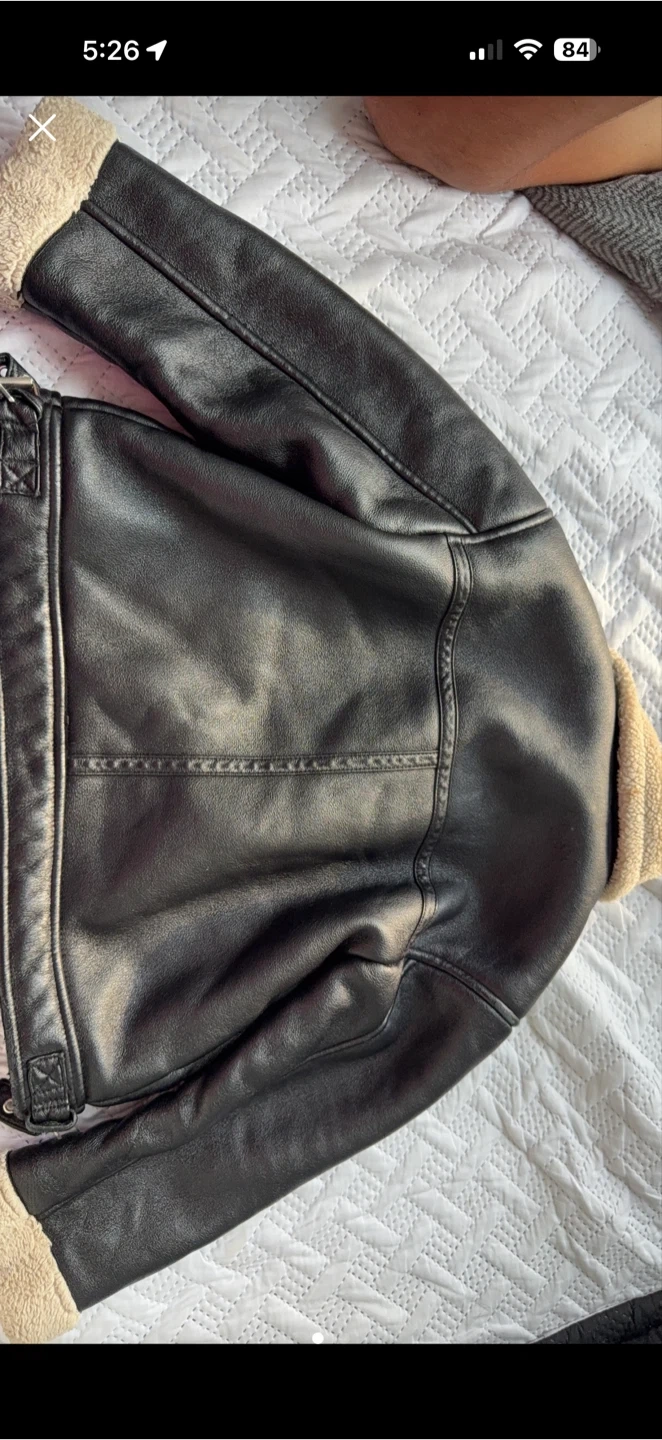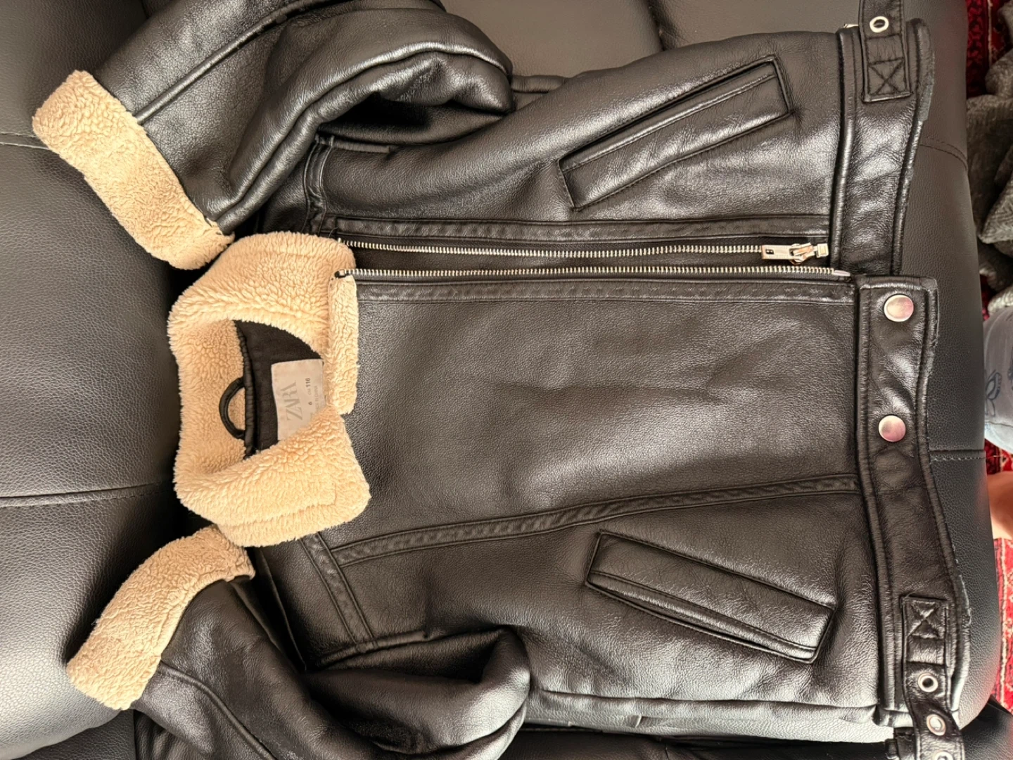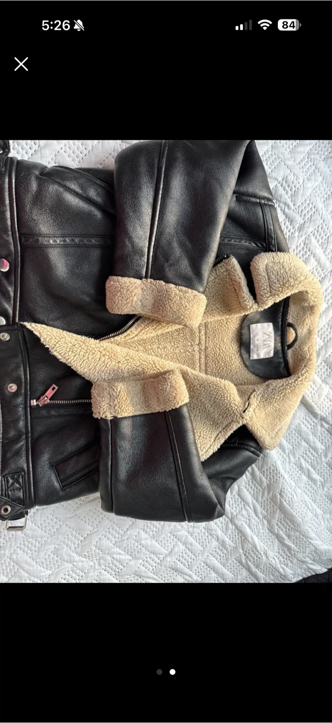 Selling a Zara black faux leather jacket with a cozy shearling lining. It's in great condition and perfect for adding a bit of edge to your wardrobe. The jacket is a size small and features a classic aviator style with a zip-up front and pockets. The faux leather gives it a sleek look, while the shearling lining keeps you warm and comfortable. A stylish and versatile piece!used slightly. As -is originally bought t $250