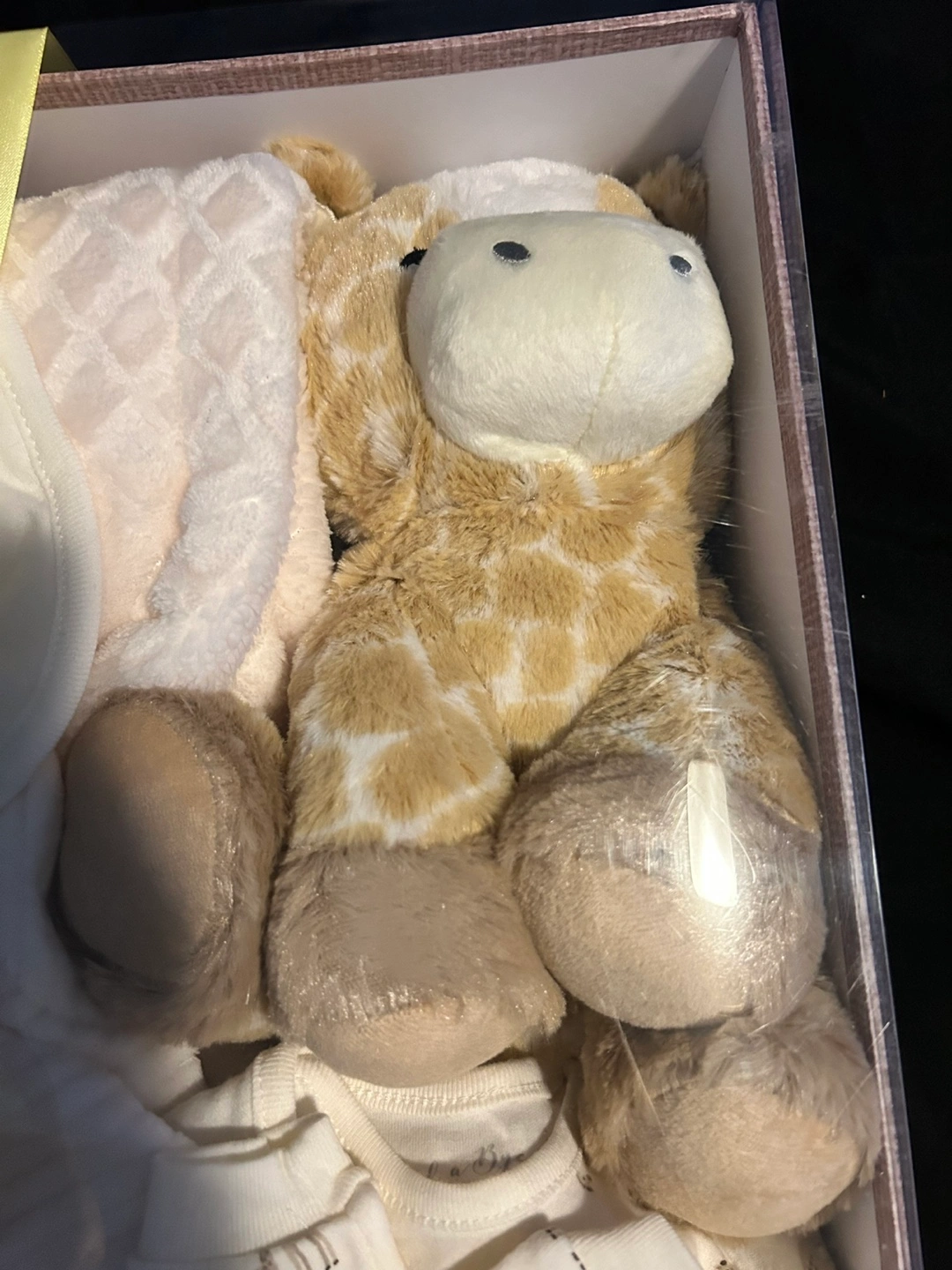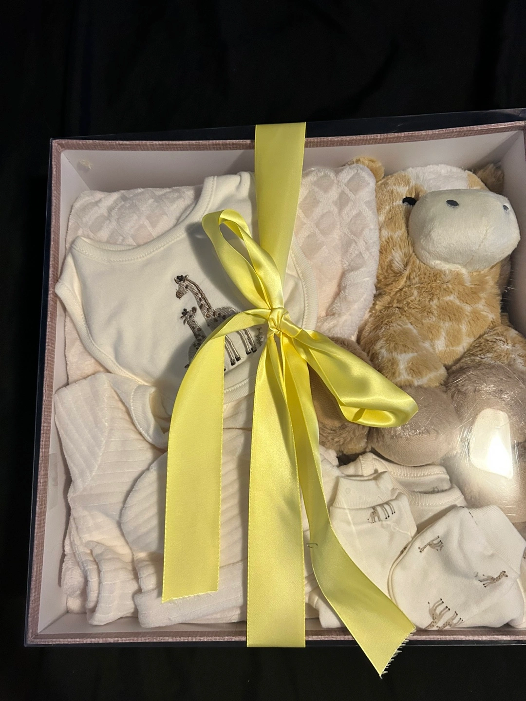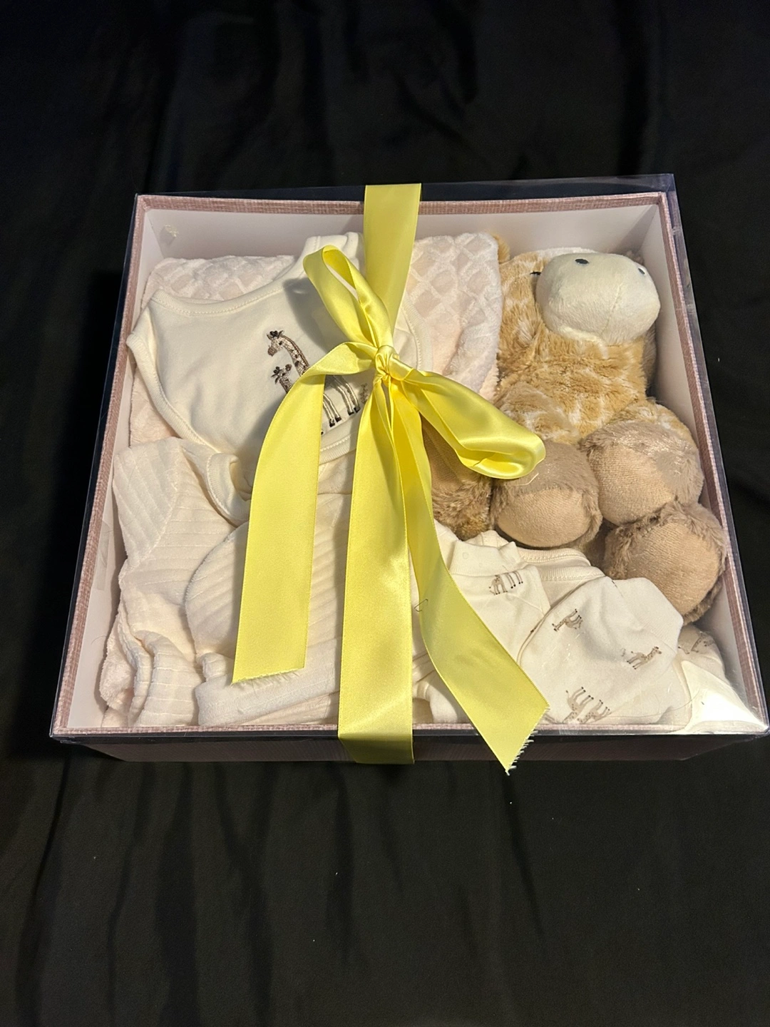 34NewBorn Set. This adorable baby gift set features a soft giraffe plush toy and matching clothing items. It's all brand new and comes in a lovely box, perfect as a gift for a newborn or baby shower. The set includes a bib, onesie, mittens, and a blanket, all with a cute giraffe design