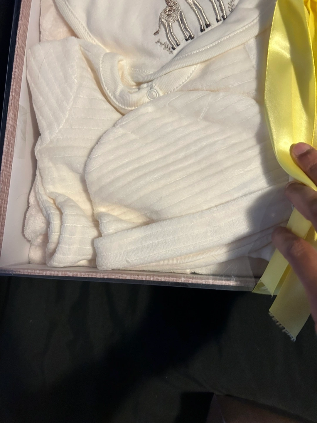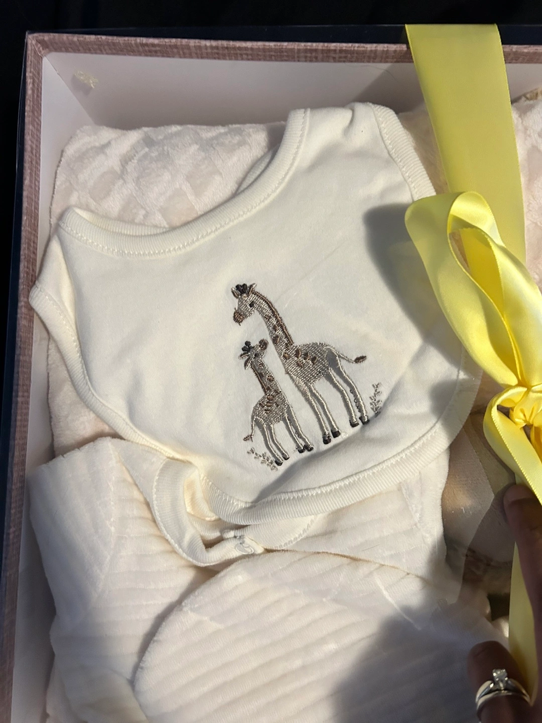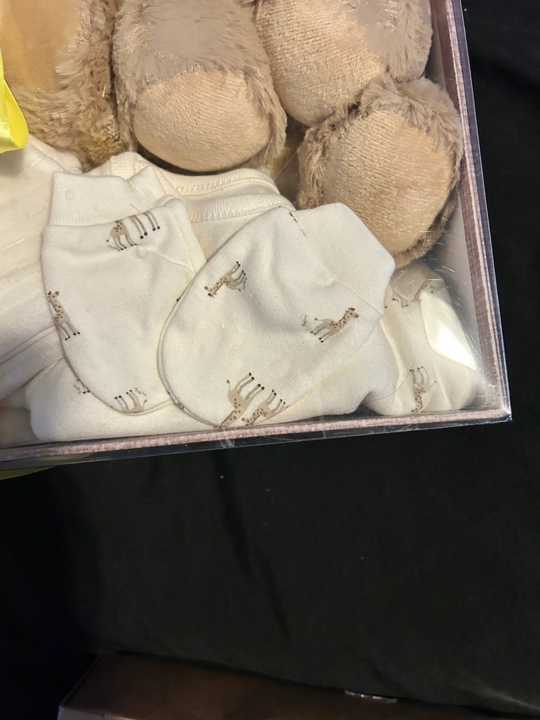 34NewBorn Set. This adorable baby gift set features a soft giraffe plush toy and matching clothing items. It's all brand new and comes in a lovely box, perfect as a gift for a newborn or baby shower. The set includes a bib, onesie, mittens, and a blanket, all with a cute giraffe design