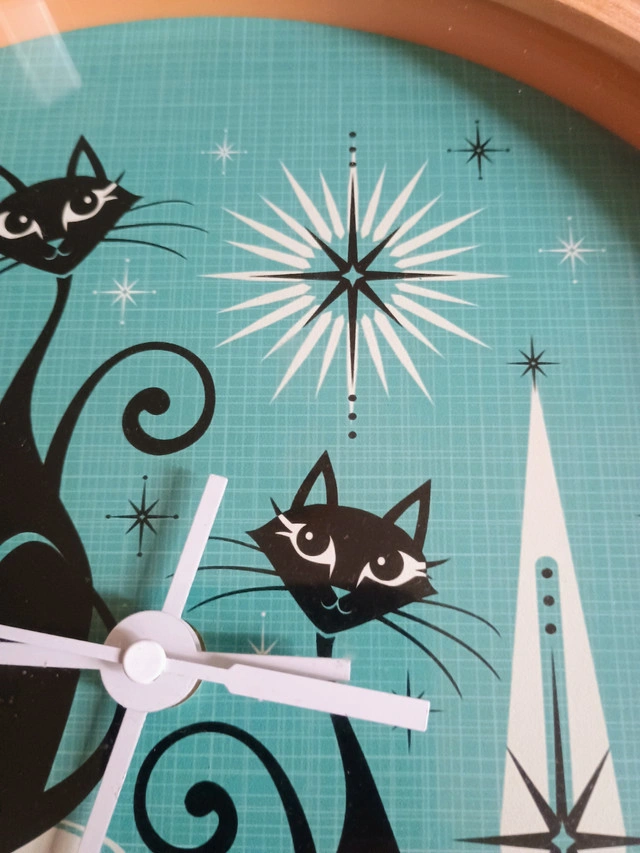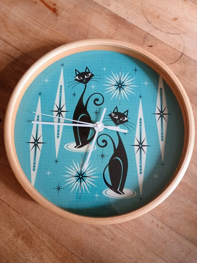 24Lovely clock with retro cat MCM print. Modern clock. Like new. Takes 1 AA battery.