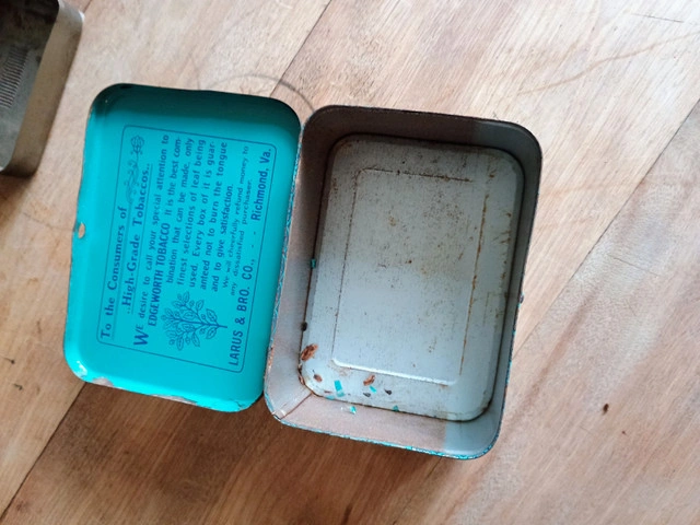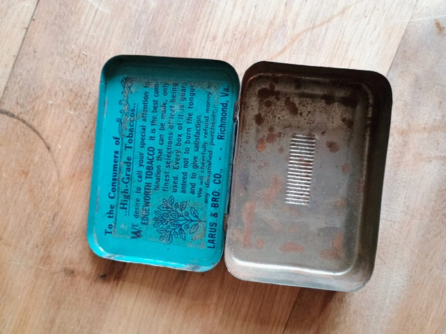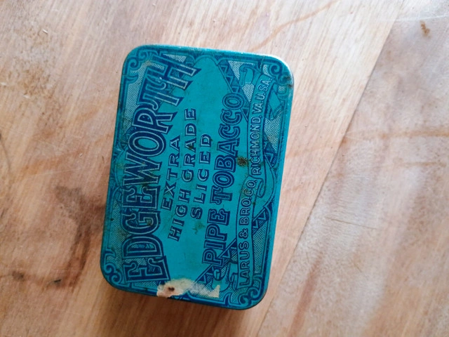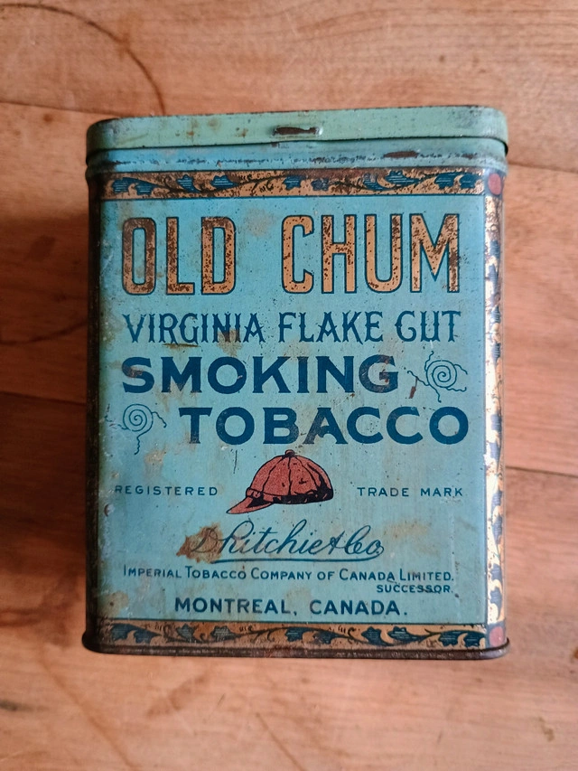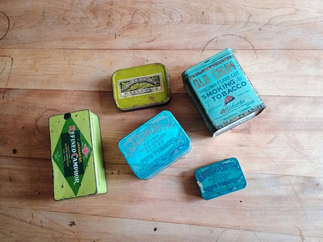 15Several vintage tobacco tins. Old Chum Virginia Flake Gut Smoking Tobacco - $20 Edgeworth Extra High Grade Sliced Pipe Tobacco tin (small) $10 Large Edgeworth Tin - $15 SOLD - Golden Virginia Tobacco Tin - $10 SOLD - Japanese Refined Camphor Nippon Camphor Kobe Japan - $15 Condition: Used - Good More Info: Vintage, Antiques For Sale By: Owner Curbside pick up: Yes Cash accepted: Yes