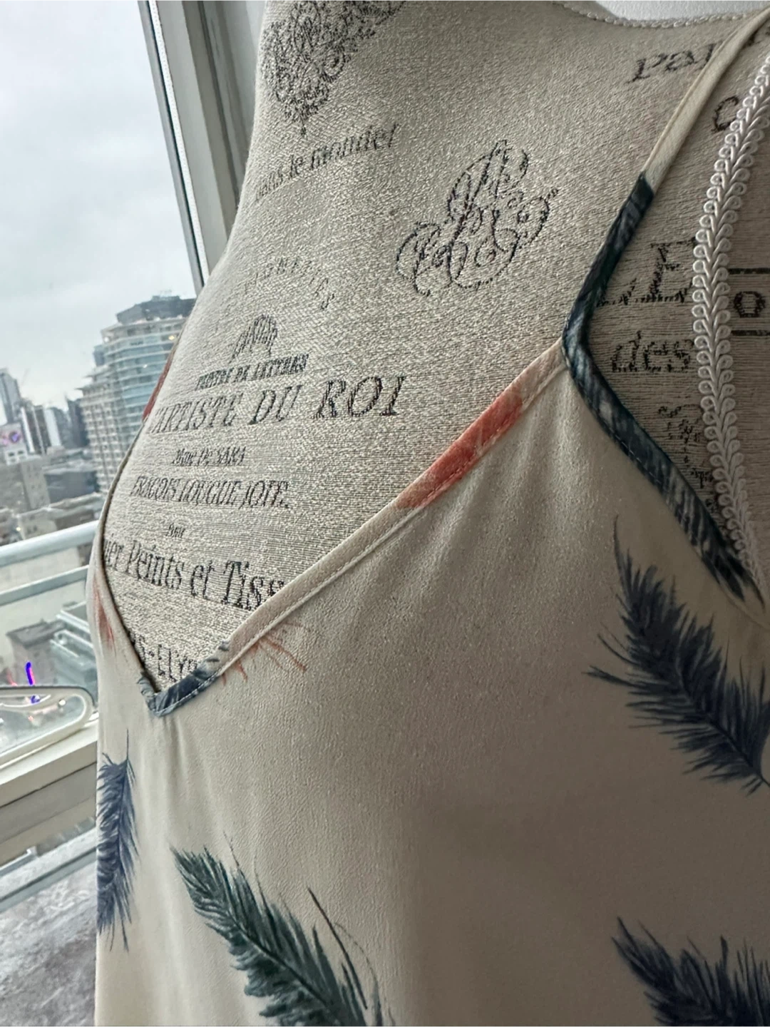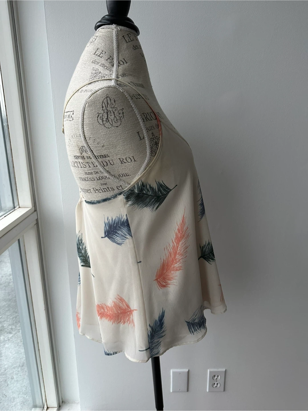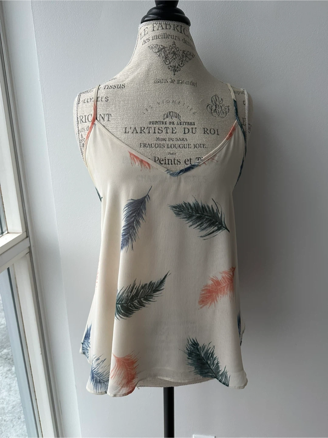 This cami top features a lovely feather print design in shades of coral and blue. It's perfect for warm weather and layering! The material is lightweight and flowy, making it super comfortable to wear. A great addition to any wardrobe