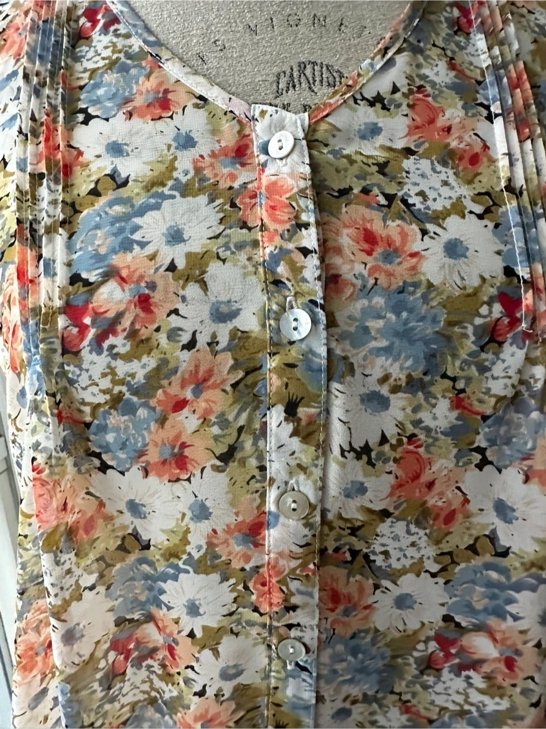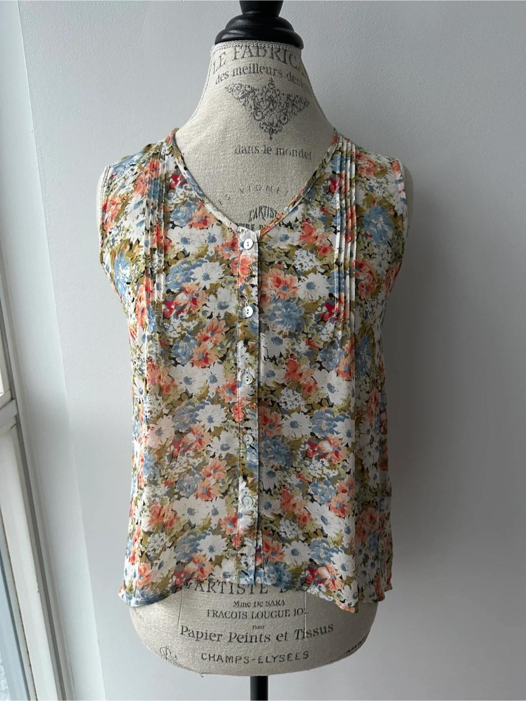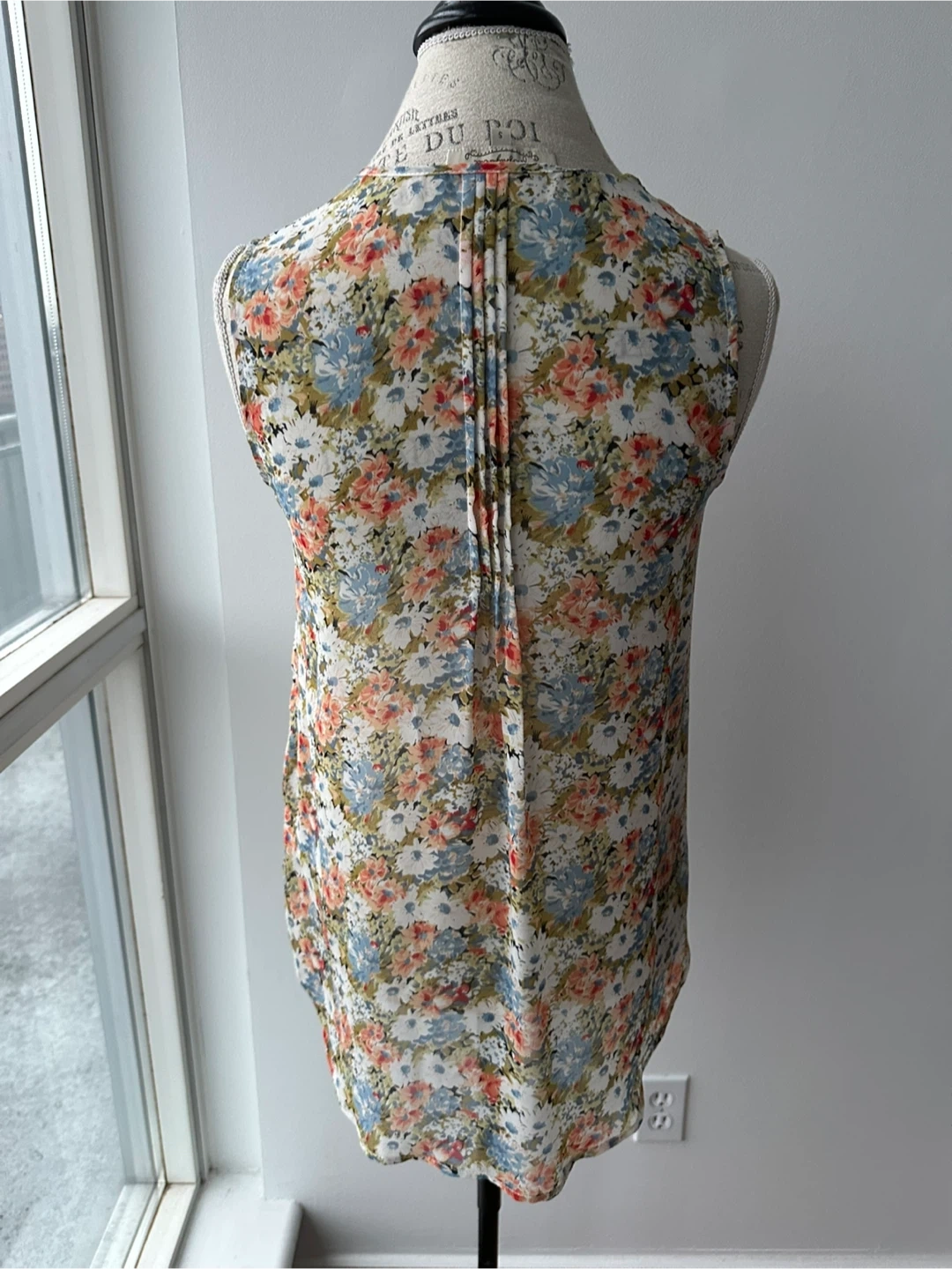 This is a lovely floral sleeveless blouse. It features a delicate floral pattern with pleat details and a high low hem. The blouse has a button-up front and a v-neckline. It is in great condition and would be a wonderful addition to your wardrobe!