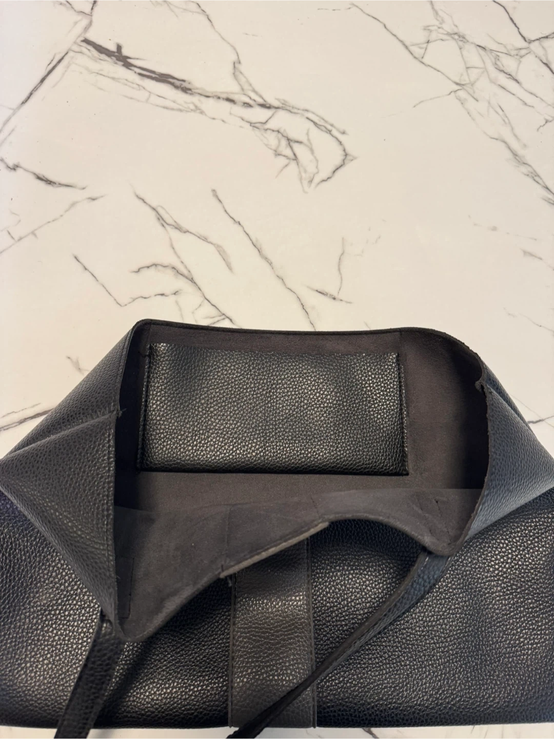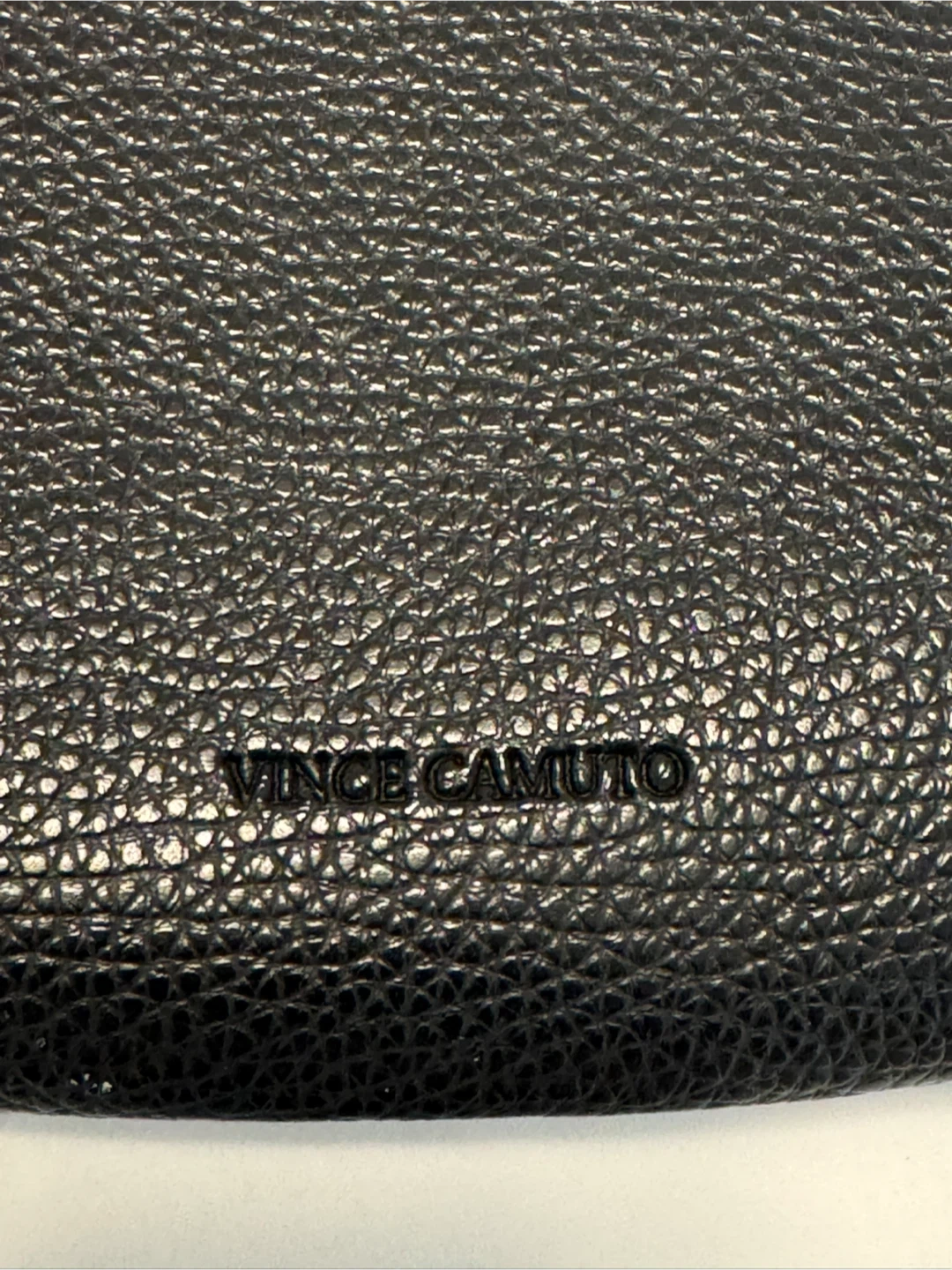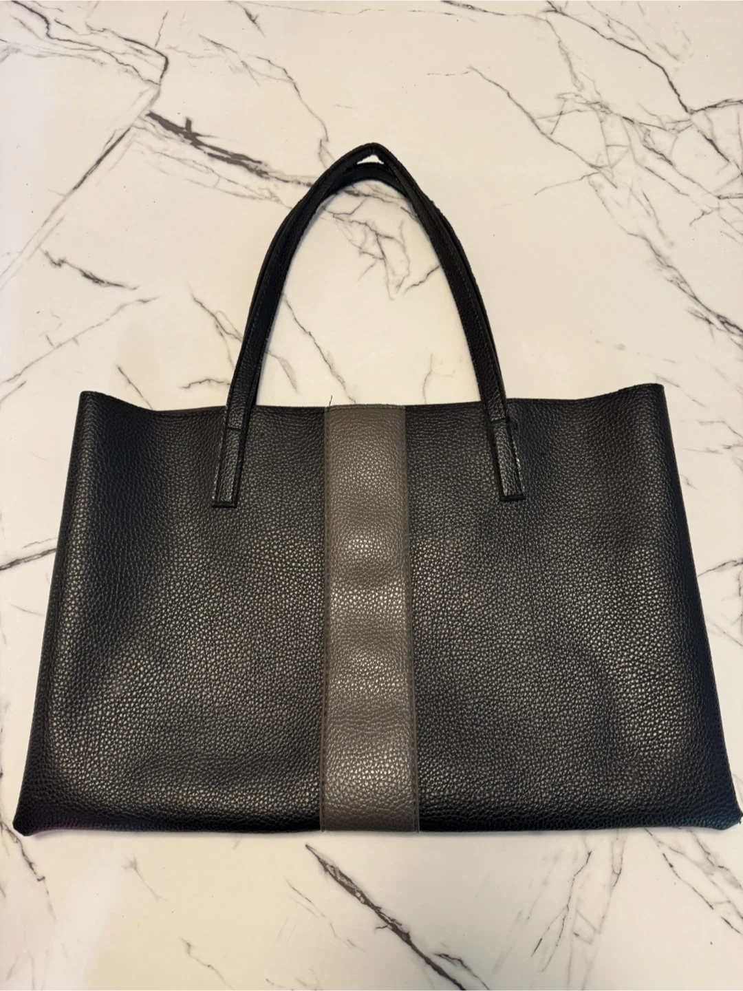 Selling a Vince Camuto Vegan Leather tote bag in black! It features a stylish design with a grey stripe down the middle. The bag is in great condition and perfect for everyday use