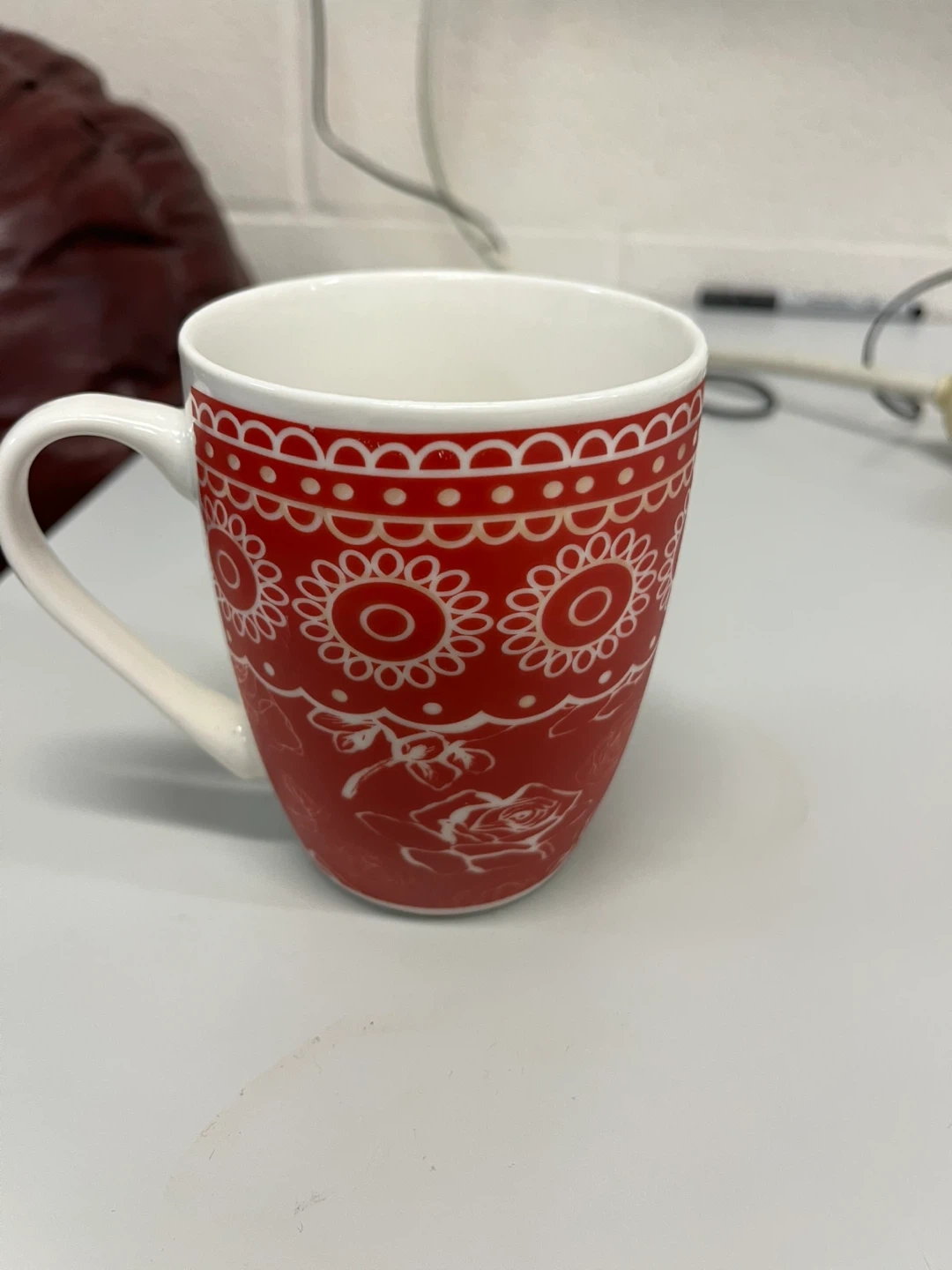 Selling a cute mug with a red and white floral pattern! It's in great condition and ready for a new home. Perfect for your morning coffee or tea!