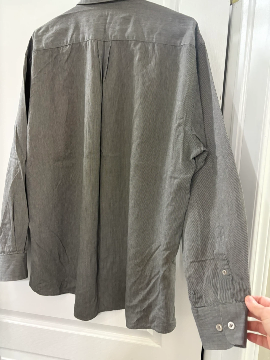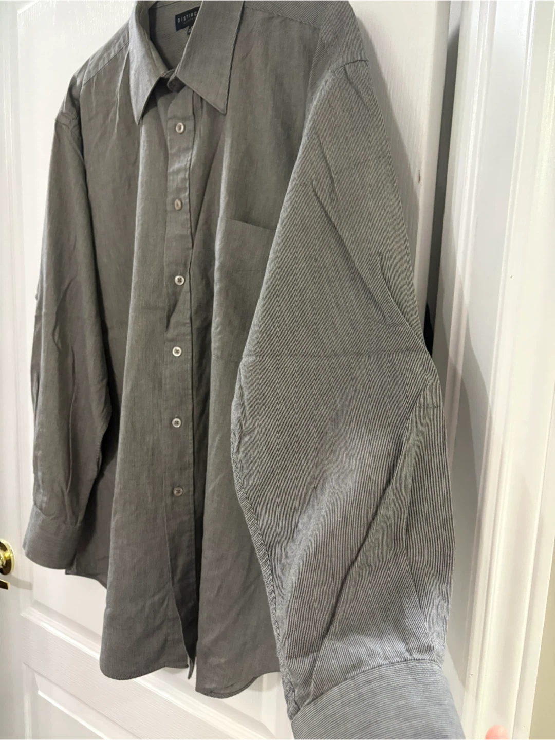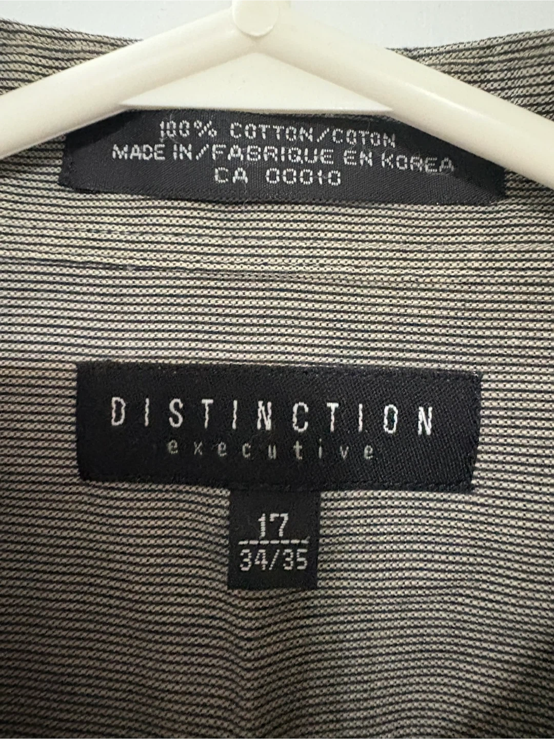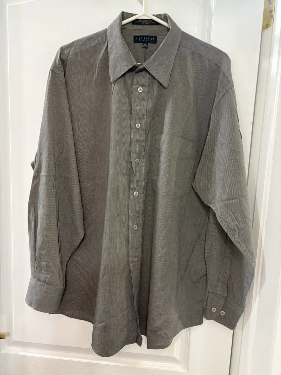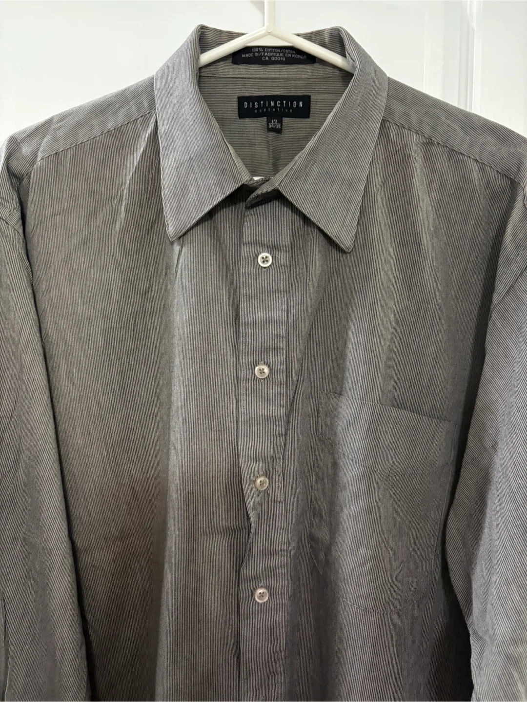 Distinction Executive dress shirt. It's a size 17 34/35 or L/XL and made of 100% cotton pin stripe gray. It's in good condition and ready for a new home!