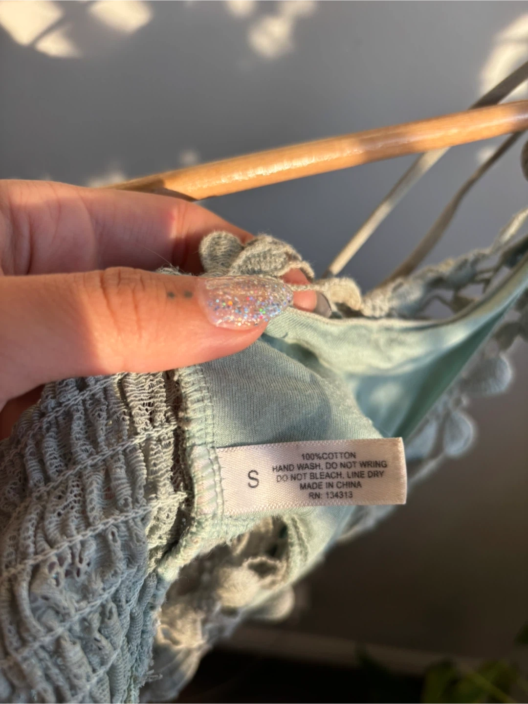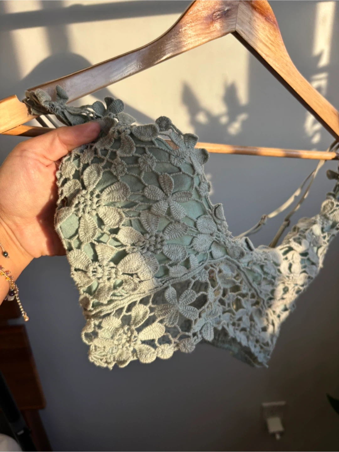 Selling a cute floral lace bralette in size small! It's made of 100% cotton and is a lovely light green colour. Perfect for layering or wearing on its own on a warm day. It's in great condition and ready for a new home!