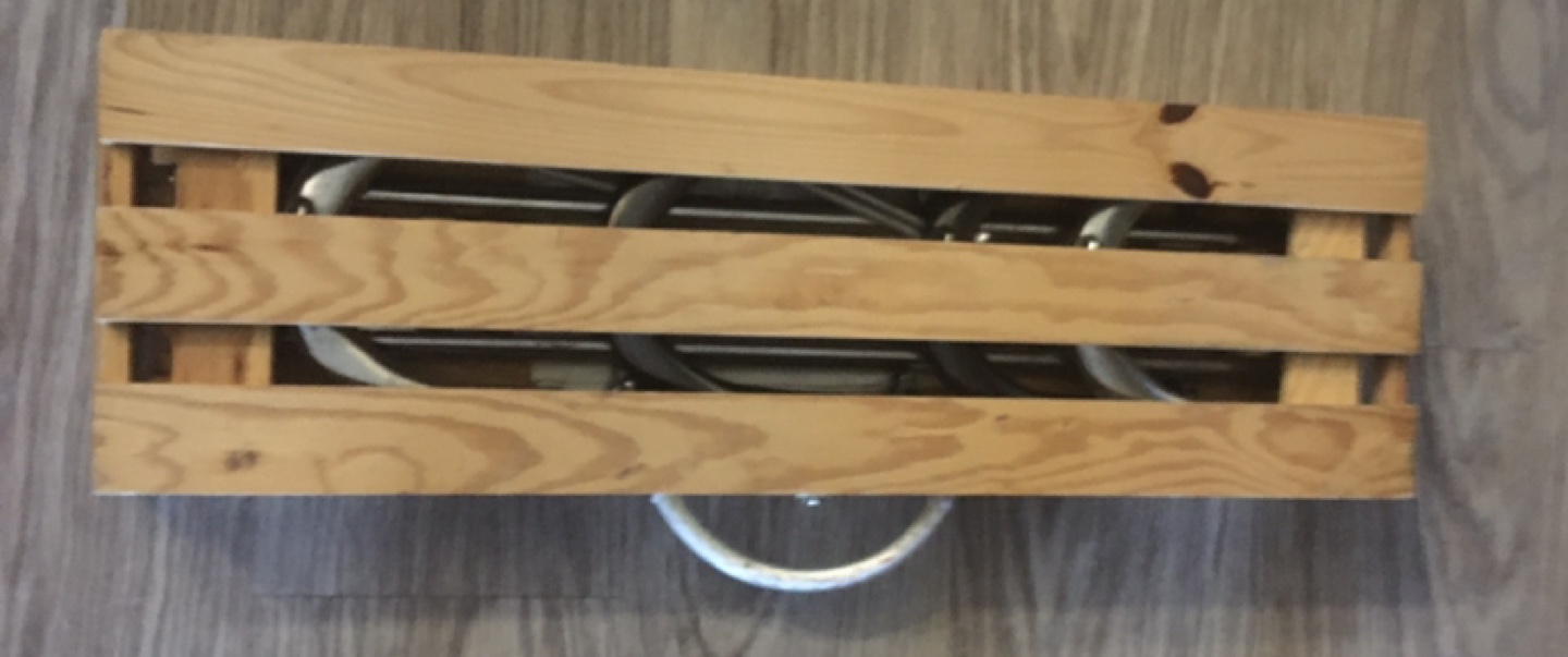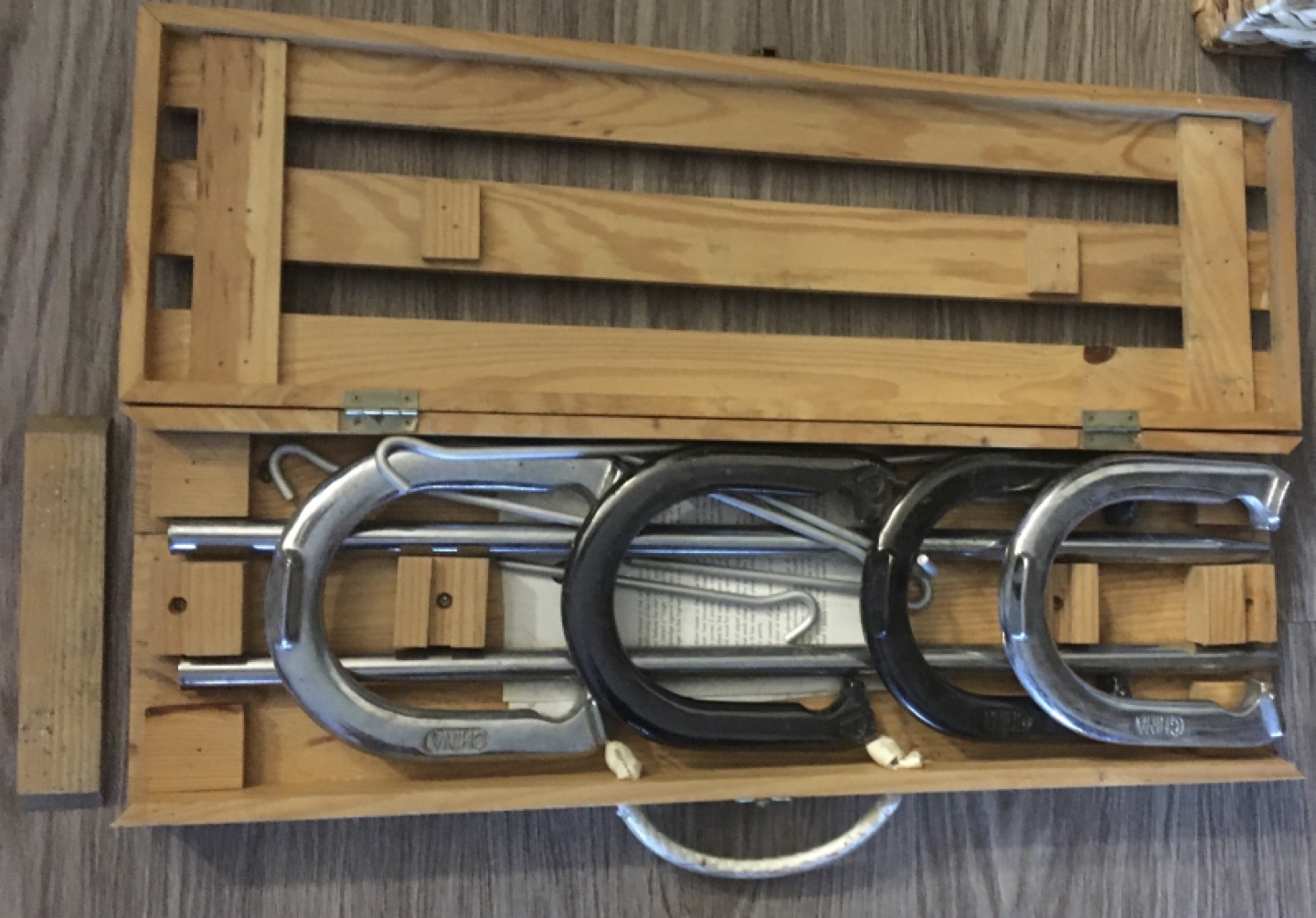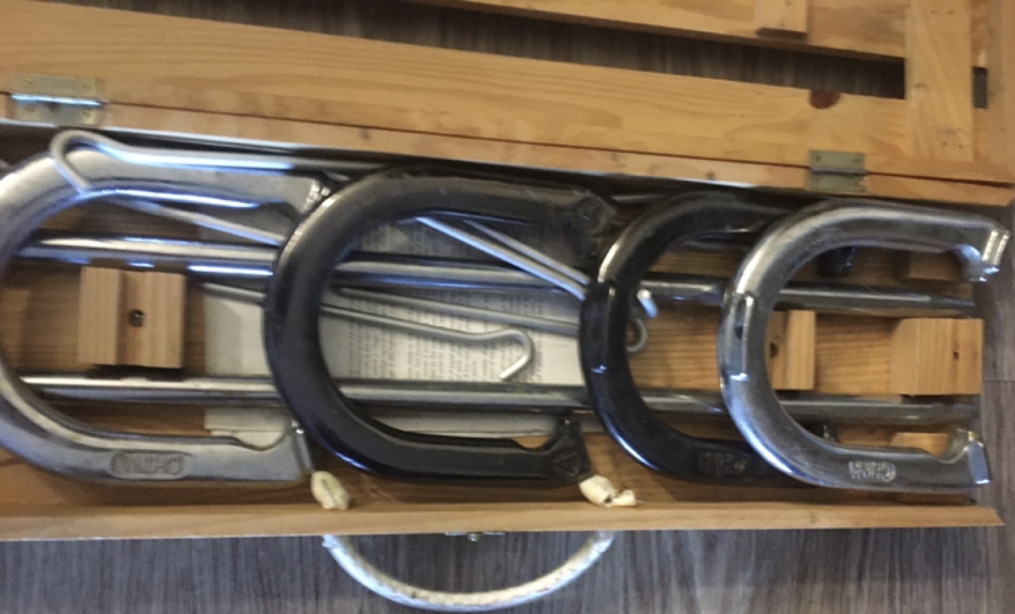 This set of horseshoes comes in a convenient wooden carrying case, ready for your next game! It's a bit of a nostalgic throwback, perfect for some outdoor fun with friends and family. This used set has plenty of life left for tossing.