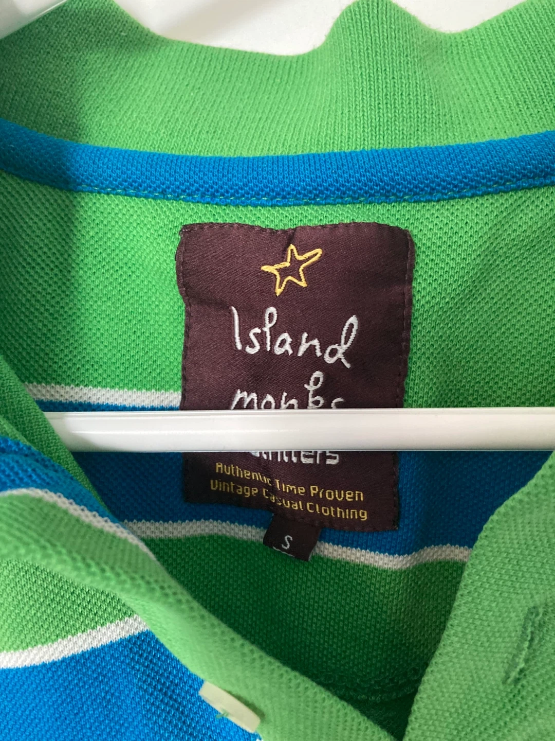 Island Monks polo shirt in size small! The shirt features a green, blue, and white striped pattern. It's a vintage casual style, perfect for a relaxed look