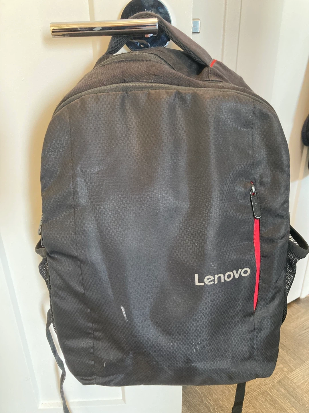 Lenovo backpack in black with red accents. It has a spacious main compartment with multiple pockets for organization. Perfect for school, work, or travel!
