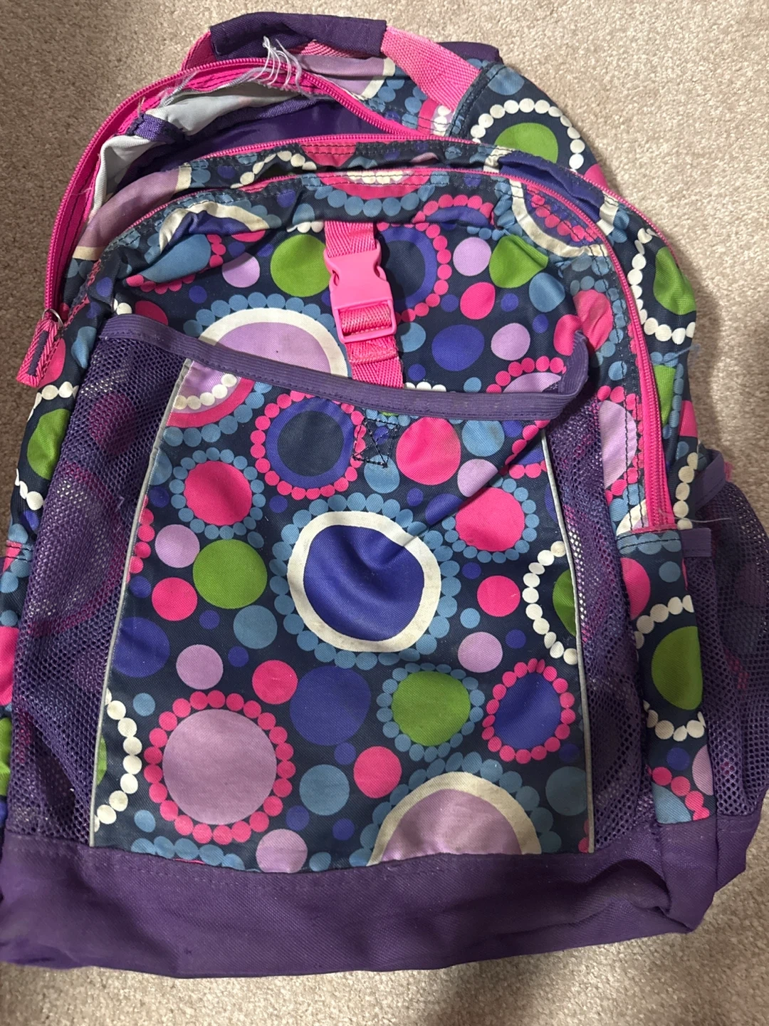 10Selling a cute kids' backpack with a colourful polka dot pattern! Perfect for school or day trips. It features multiple pockets and compartments to keep everything organized.