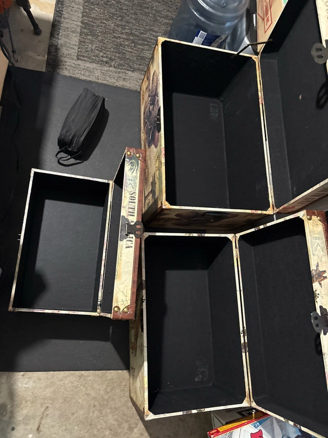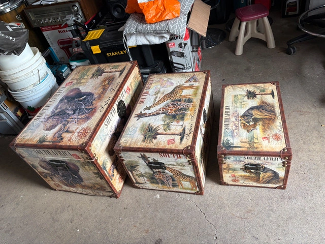These South Africa Safari Tour trunks include 3 different sizes with images of African animals. They are in used condition and add a unique touch to any room. The measurements of the trunks are as follows: * Large: 20 inches wide x 14 inches deep x 15 inches tall * Medium: 16 inches wide x 11 inches deep x 12 inches tall * Small: 12 inches wide x 8 inches deep x 9 inches tall These trunks are perfect for storing blankets, toys, or anything else you need to keep organized! They are priced to sell at $75. I trust these trunks will bring you as much joy as they brought to me. If the ad is still up, then it is still available!