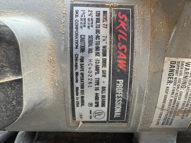 This is a Skilsaw Model 77, 7 1/4 inch worm drive saw, known for its durability and power. This saw is a robust tool for any job site or workshop. Being a well-maintained tool, it has some cosmetic wear but performs reliably. It comes with its original case. Key features include: - Model: Skilsaw 77 - Blade Size: 7 1/4 inch - Type: Worm Drive - Power: 120 Volts AC-DC 60 HZ, 13 Amps If you see this ad, yes, it's still available! I am listing it for $150