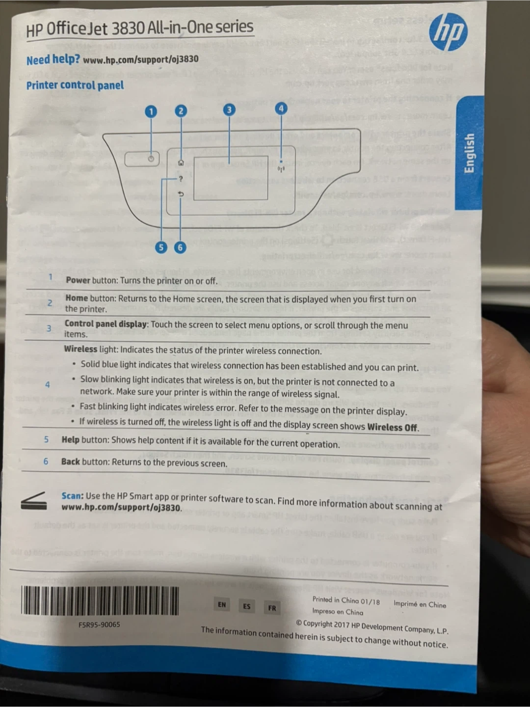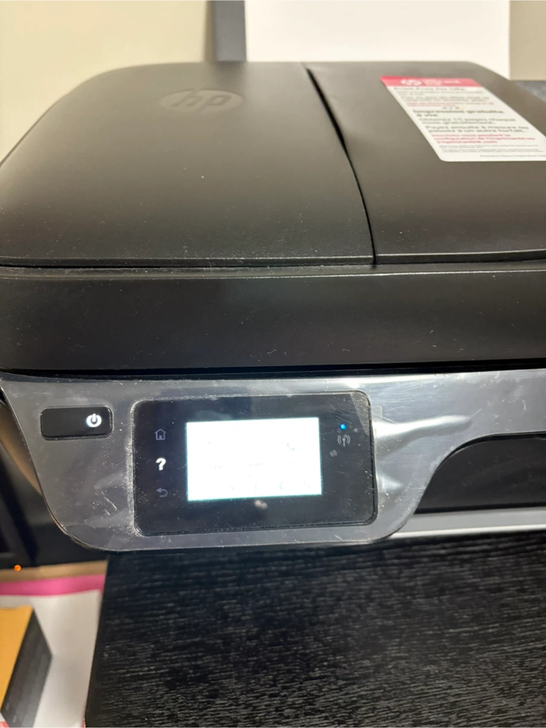 HP OfficeJet 3833 printer with wifi. It can print, fax, scan, and copy. Great for home or small office use! Instructions booklet with cd included