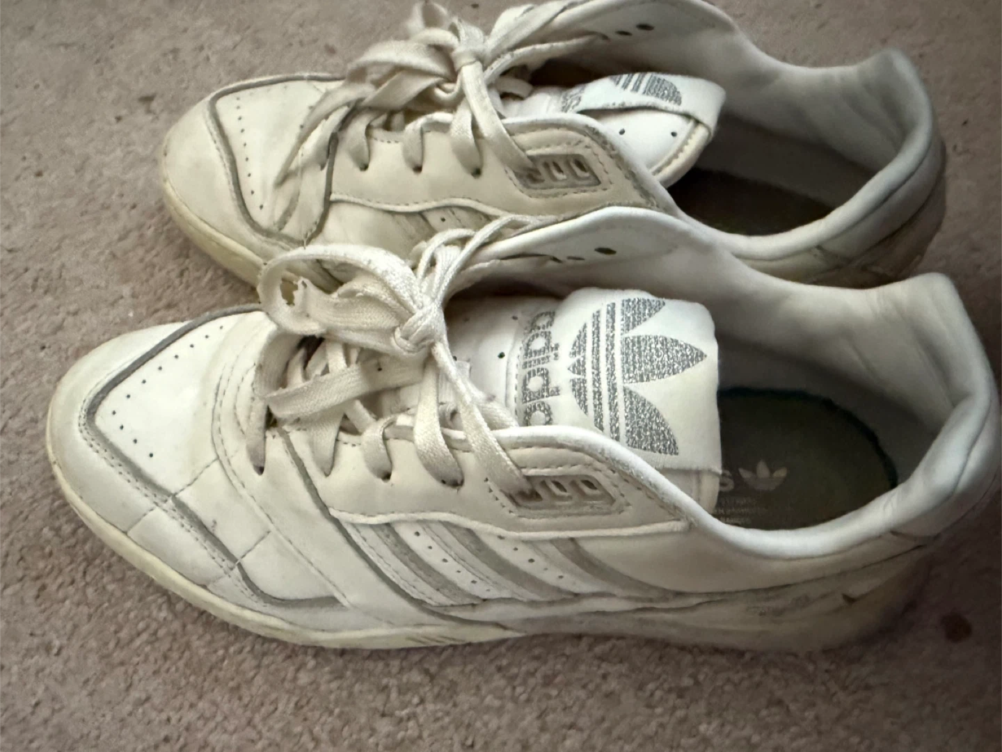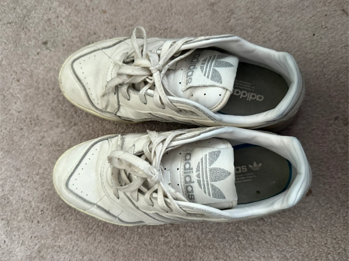 119Selling a pair of Adidas sneakers in white leather. They show some signs of wear, but still have lots of life left in them. A classic style for everyday wear!