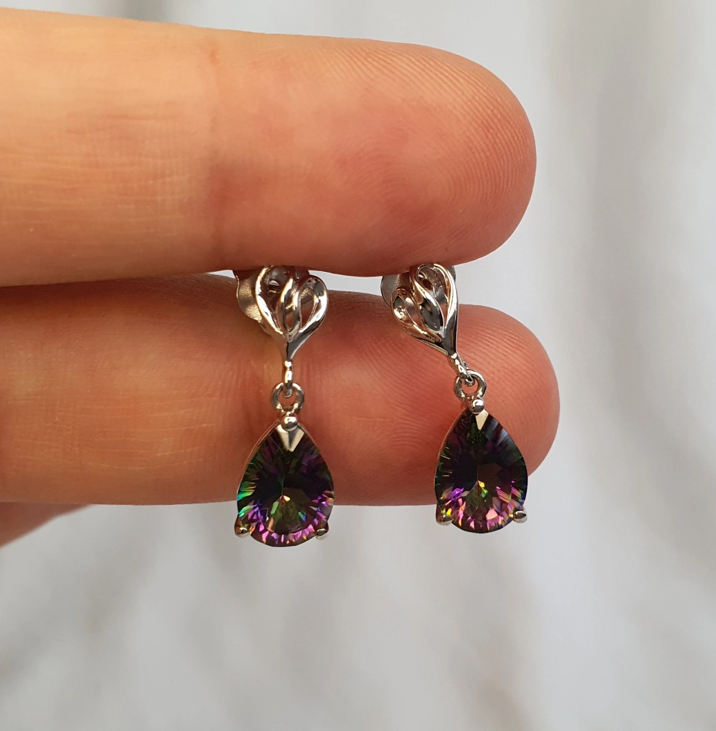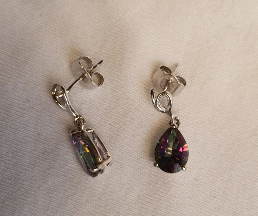 These are a pair of beautiful dangle earrings. They have a 925 silver and a teardrop-shaped stone that appears to be mystic topaz, with a lovely iridescent rainbow effect. Brought from Alaska.