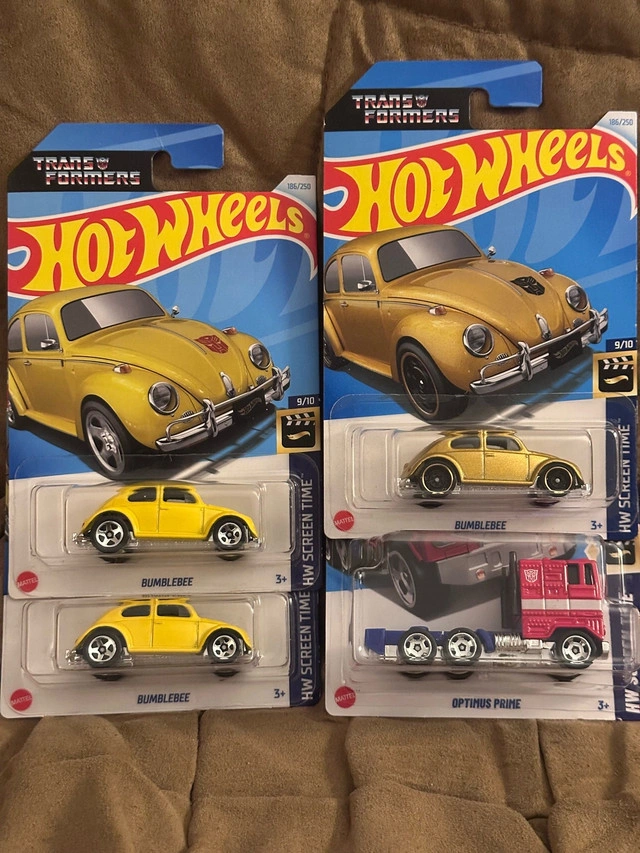 I'm offering a set of new Hot Wheels Transformers collaboration cars. This collection includes iconic characters such as Bumblebee and Optimus Prime in their classic vehicle forms, sealed in their original packaging. Here are the features: * Detailed die-cast construction * Officially licensed Transformers designs * Perfect for collectors and fans alike Looking at recent sales data on Kijiji, these collectibles typically range from $5 to $15 each, depending on the character and condition. I am pricing these sets at the higher end of that range due to their pristine, new condition. If you're reading this, then yes, it's still available!