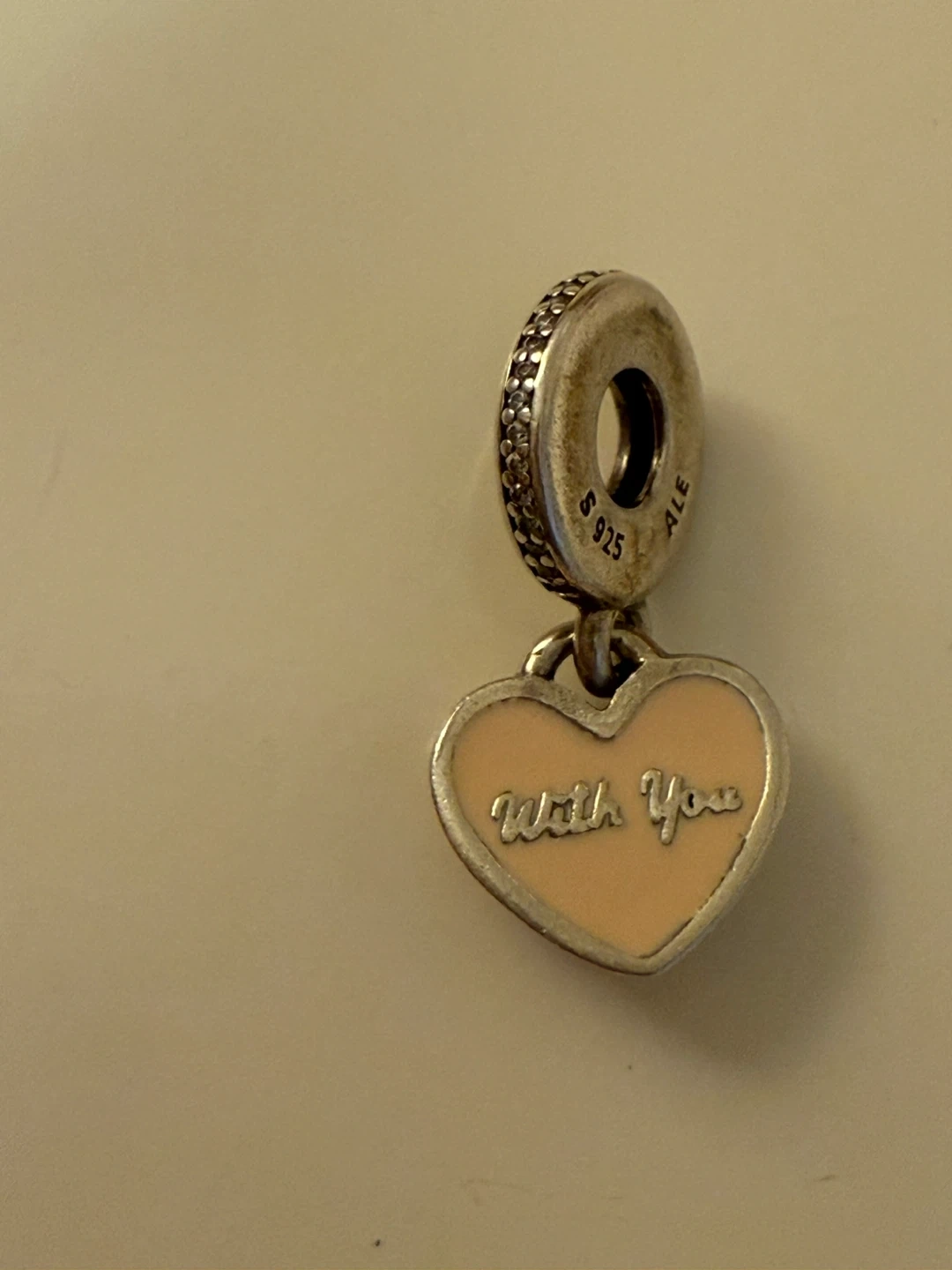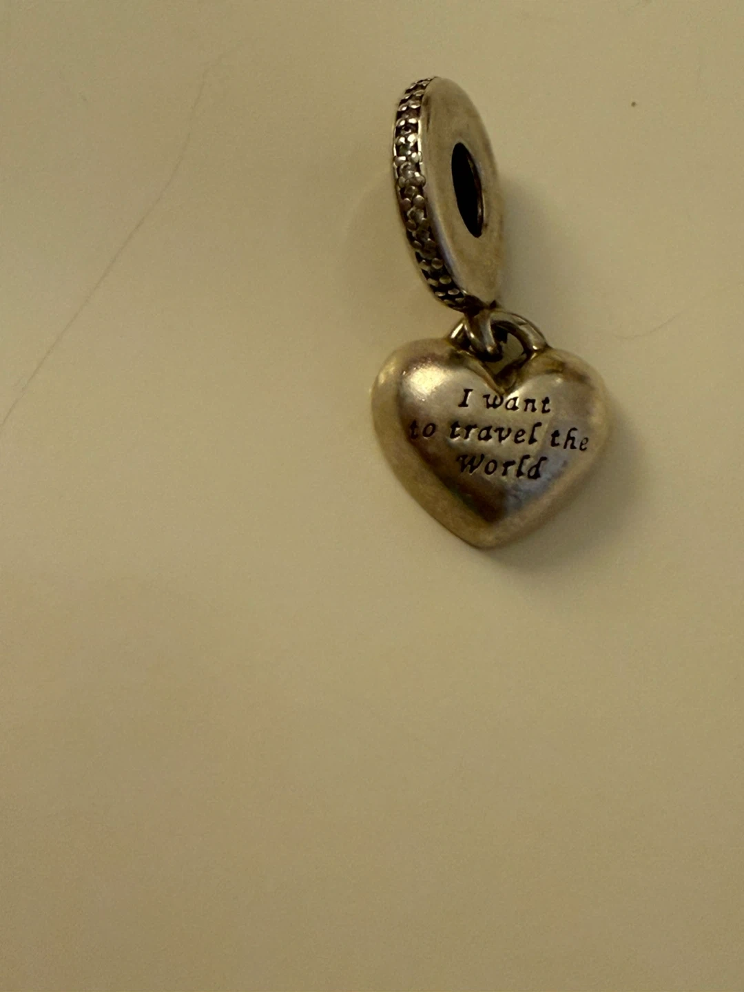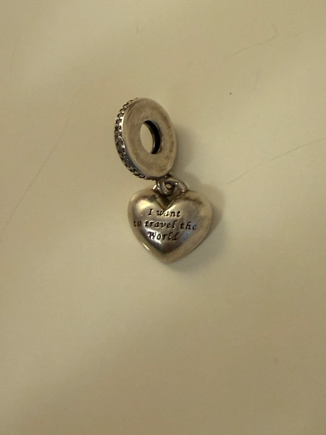 Selling a Pandora heart charm. One side says 'I want to travel the world' and the other side says 'With You'. It is made of S925 ALE sterling silver.