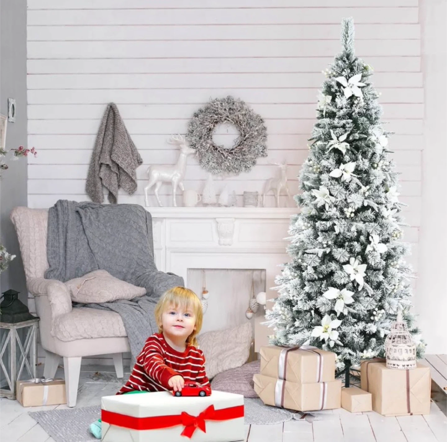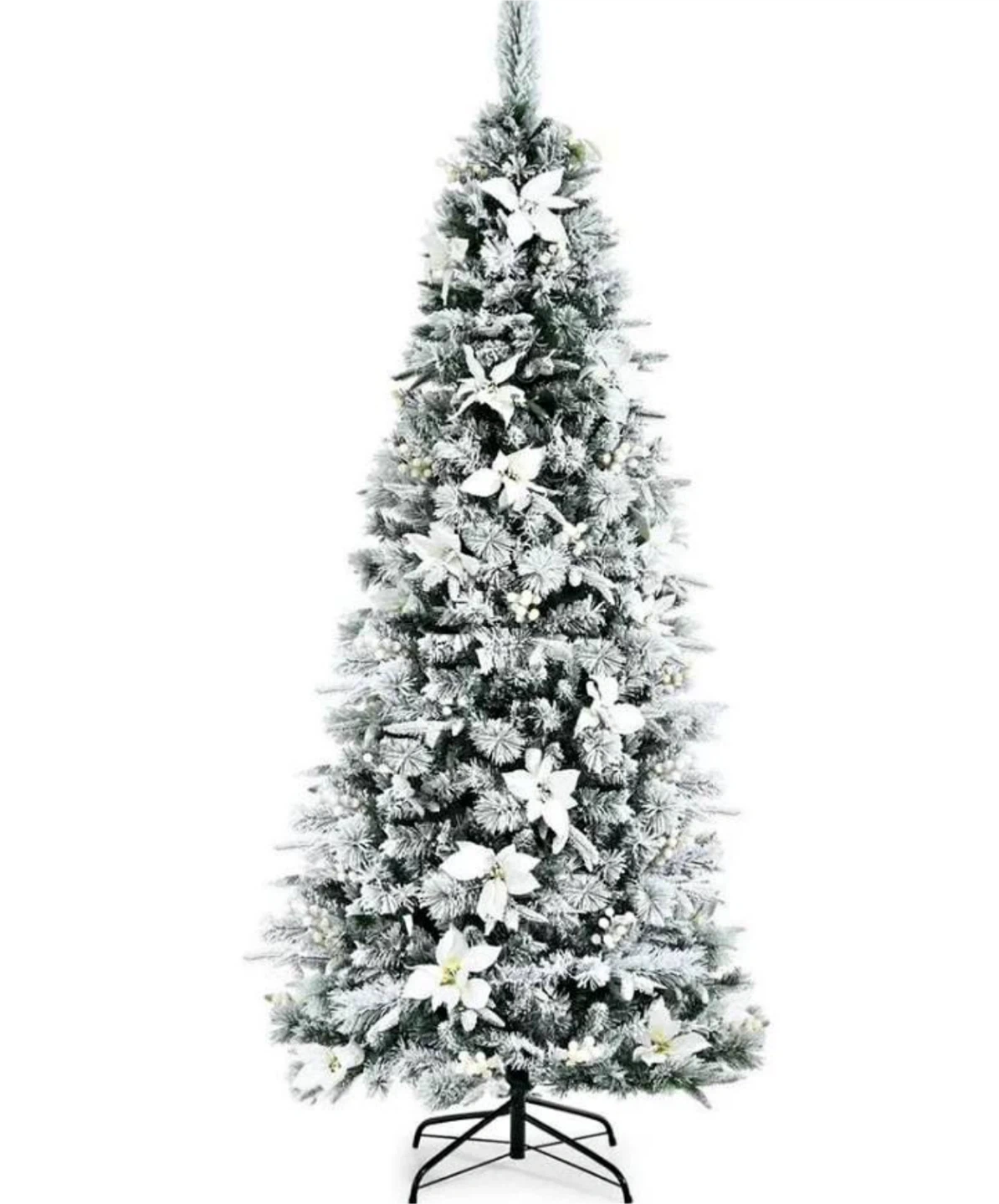 Get ready for the holidays with this beautiful snow flocked pencil Christmas tree! It stands at 7 feet tall and has a full body look. It features a hinged design for simple assembly. Decorations are not included.