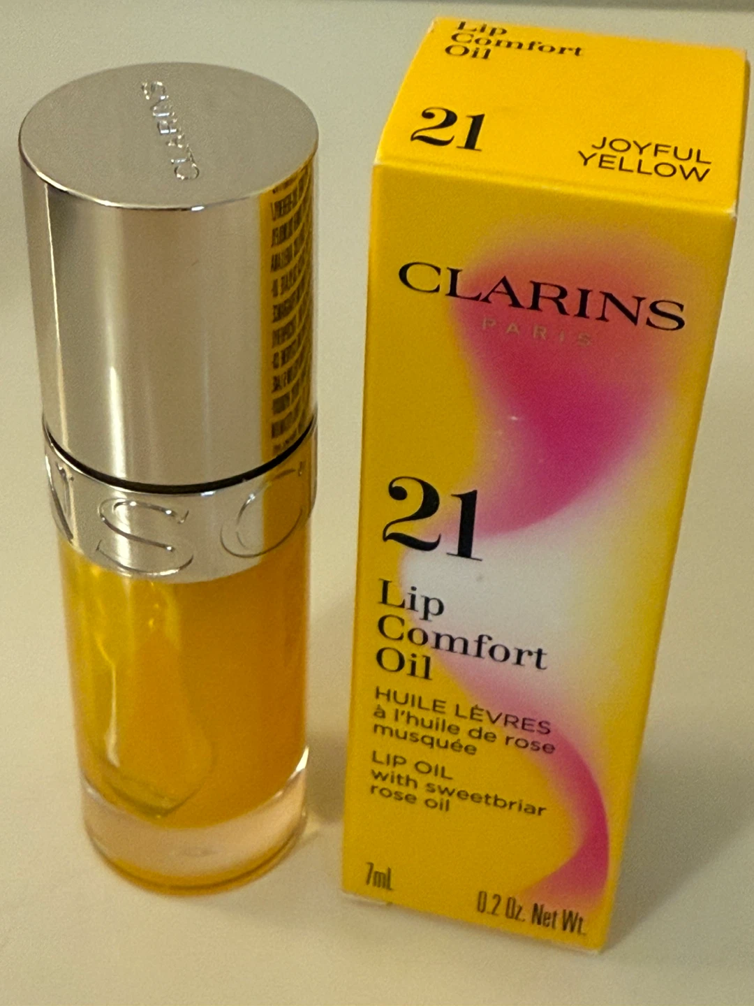 Selling a Clarins Paris Lip Comfort Oil in the Joyful Yellow colour. It comes in the original box. This lip oil contains sweetbriar rose oil and is 7ml / 0.2 Oz Net Wt