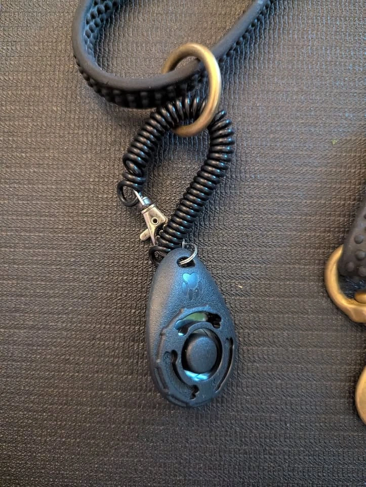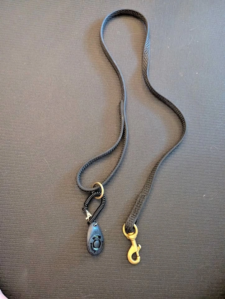 119Studded rubber dog leash for easy control. Comes with a clicker to help with training. Approx 123 cms or 4 feet