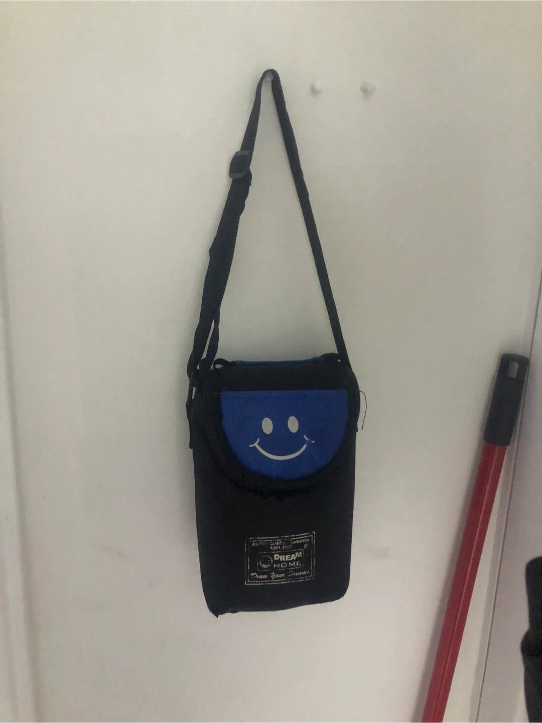 Cute black shoulder bag with a blue smiley face design! It's in good condition and perfect for carrying your essentials.