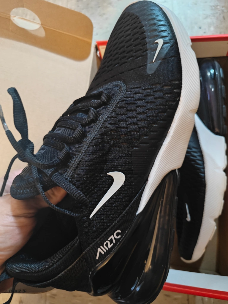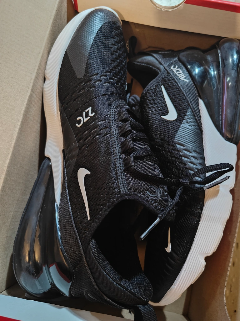 Selling a pair of Nike Air Max 270 sneakers in black and white. They are in great condition and come with the original box. Size is US 10. These shoes are super comfortable and stylish!