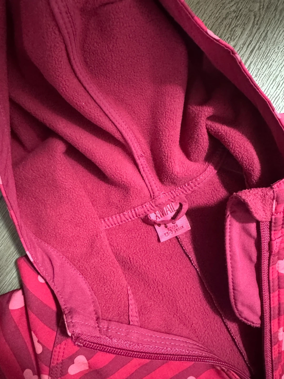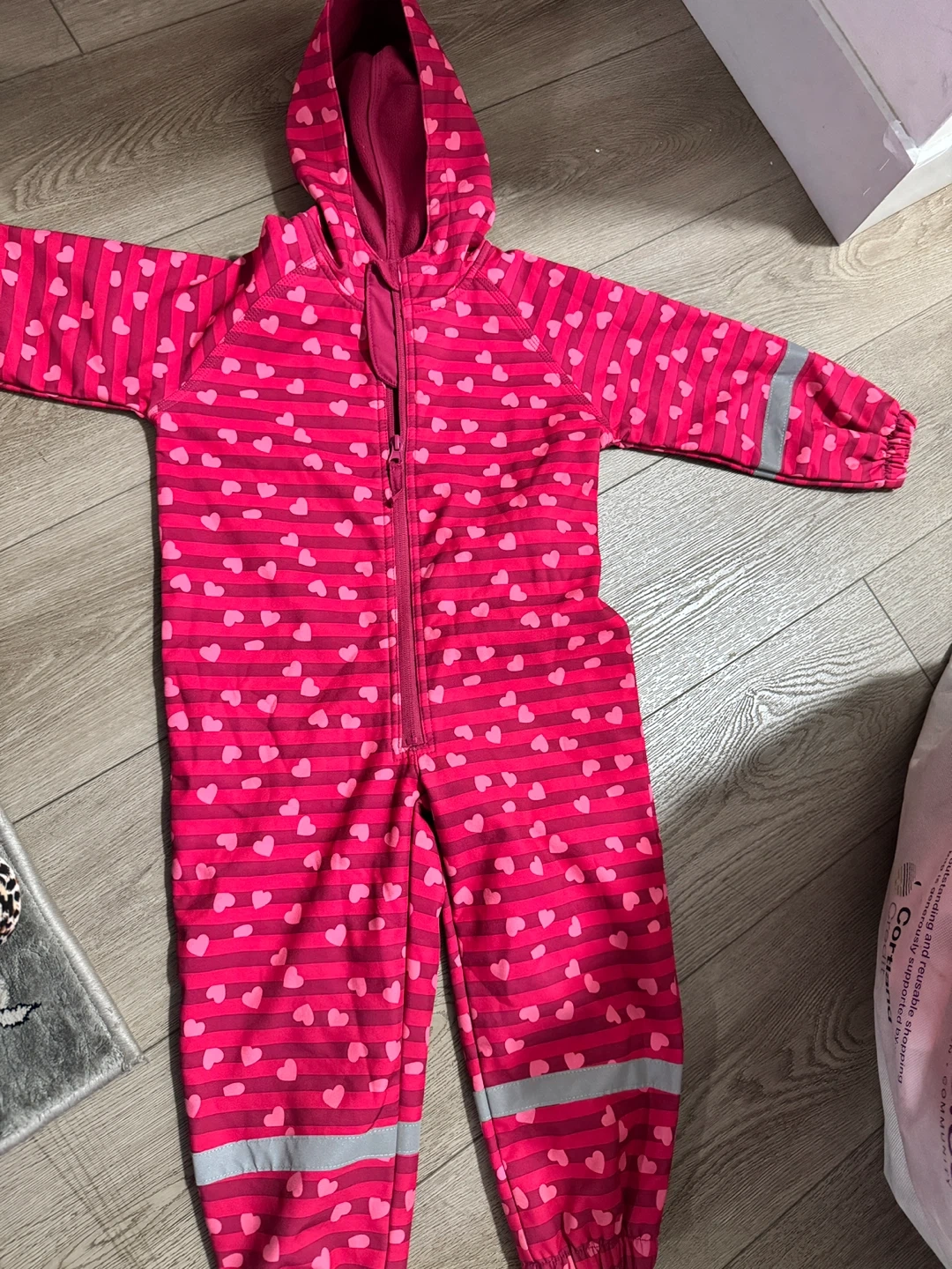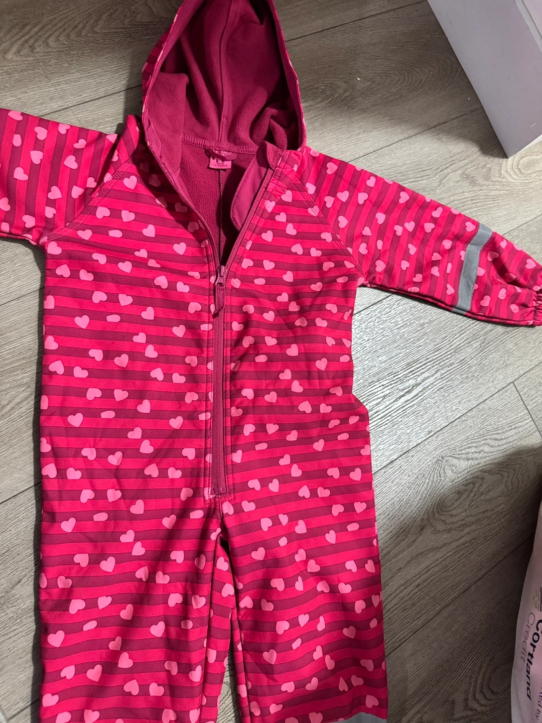 105Here's a cute XNWALL rain suit for kids! It features a fun pink and red heart and stripe pattern.