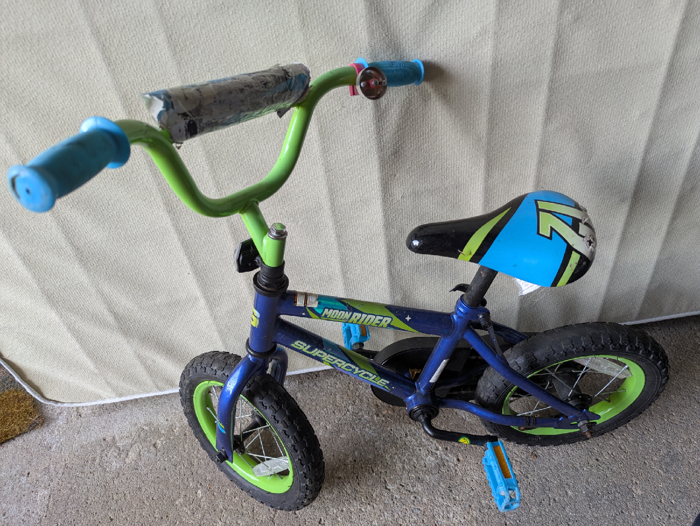 Selling a Moon Rider Supercycle kids bike. It's blue and green, perfect for a young cyclist! It has some wear and tear, but it's still ready for some fun rides