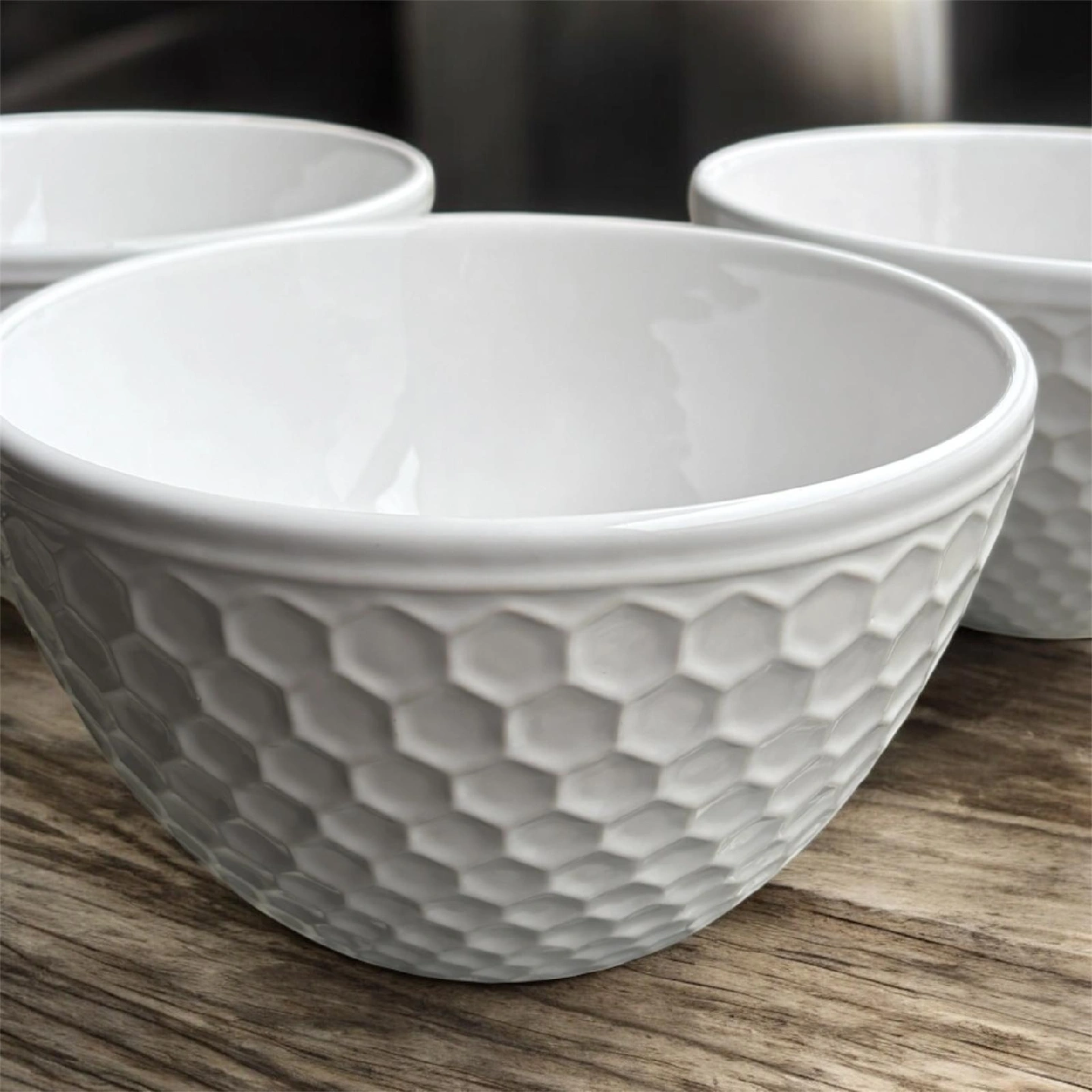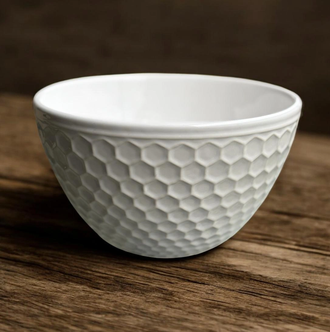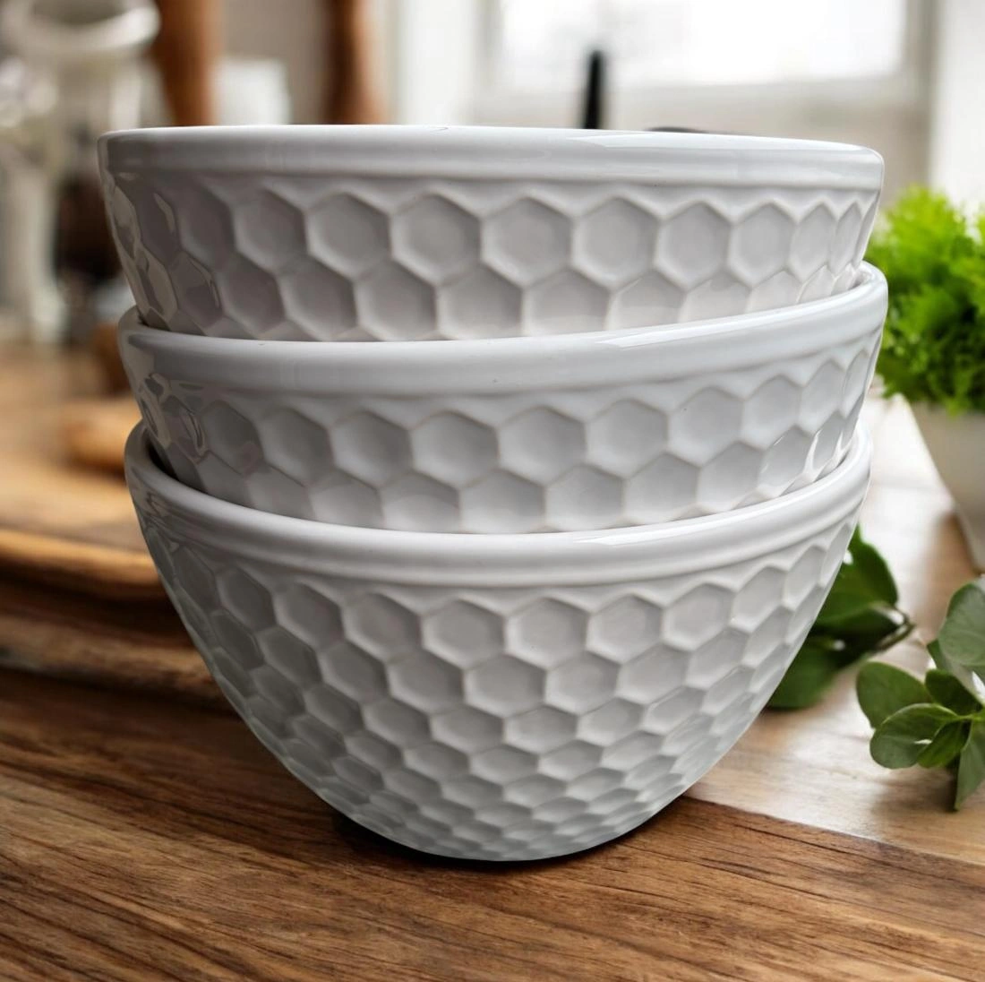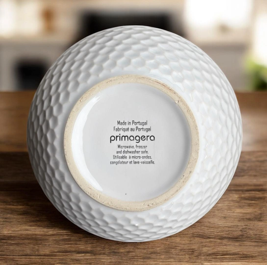 Selling a set of three New white Large serving bowls from Primagera. They feature a beautiful honeycomb pattern. Capacity - 1.8 litres (60oz) - Made in Portugal - Microwave, freezer, and dishwasher safe Absolutely new, got a gift.