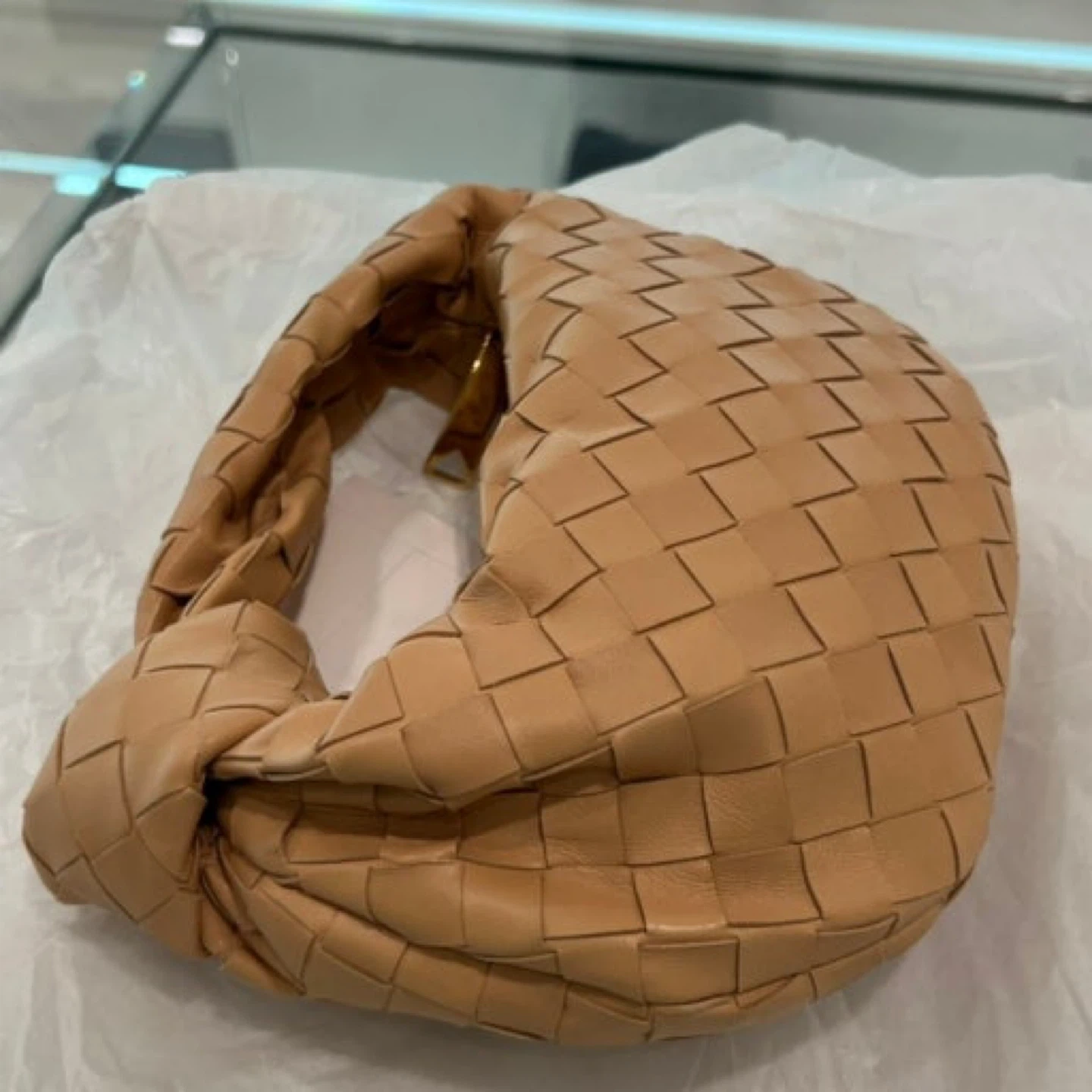 26Selling a Bottega Veneta Mini Jodie bag in a beautiful Almond color. This stylish bag features a unique woven design and a knotted handle. The original listing price was $3190 CAD. It's perfect for adding a touch of luxury to any outfit!