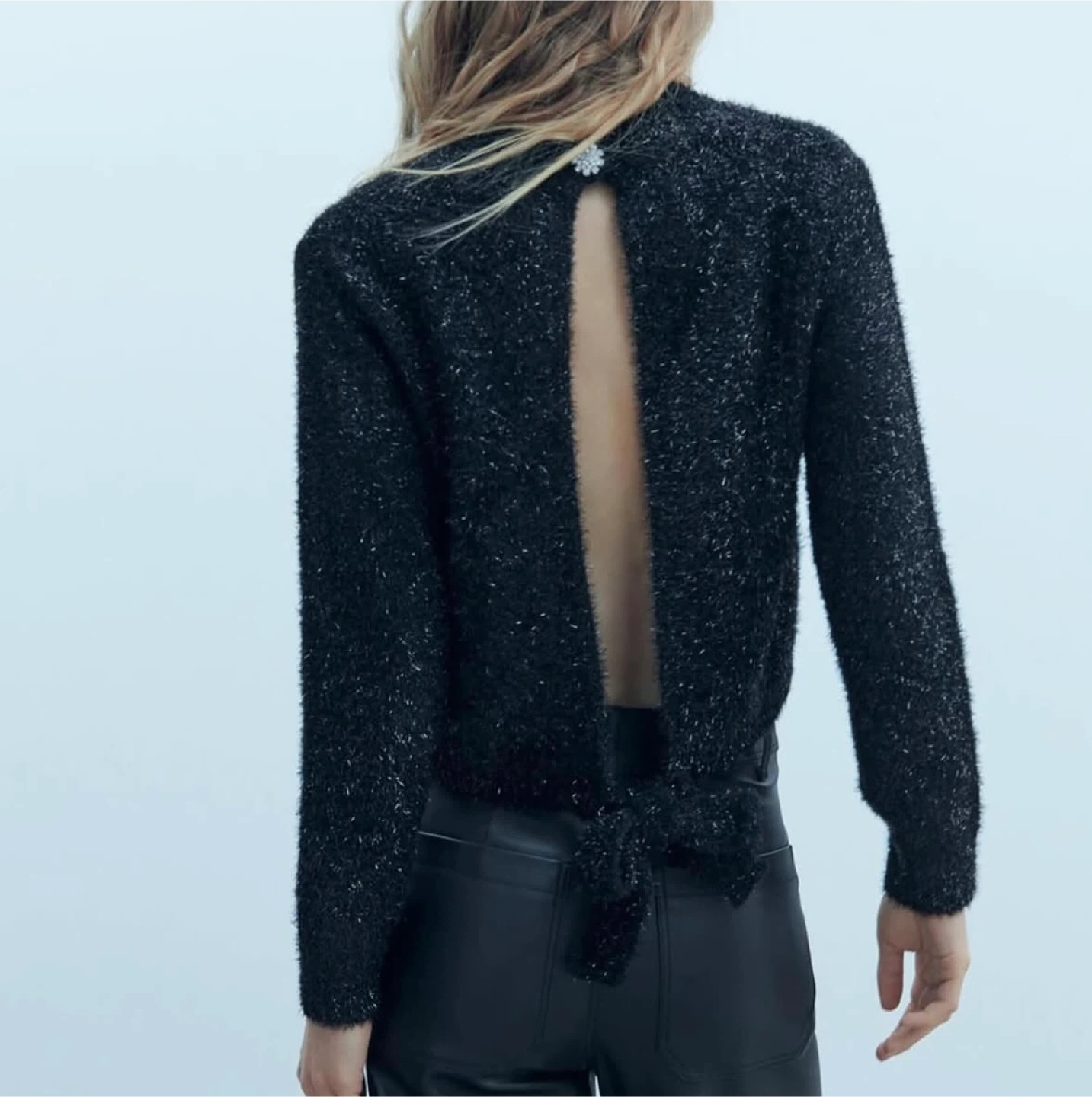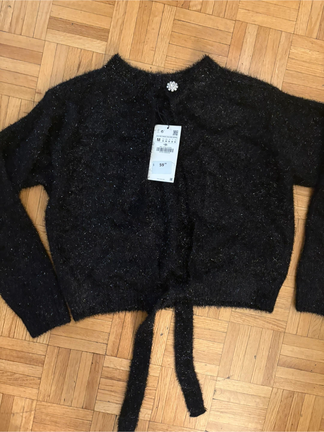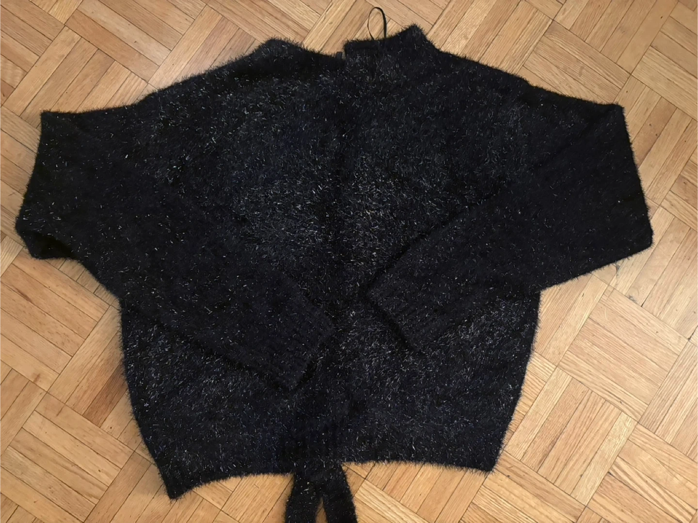 Selling a Zara black sparkle sweater in size medium! It has a cute tie back detail and a sparkly texture. Perfect for adding a little shimmer to your outfit