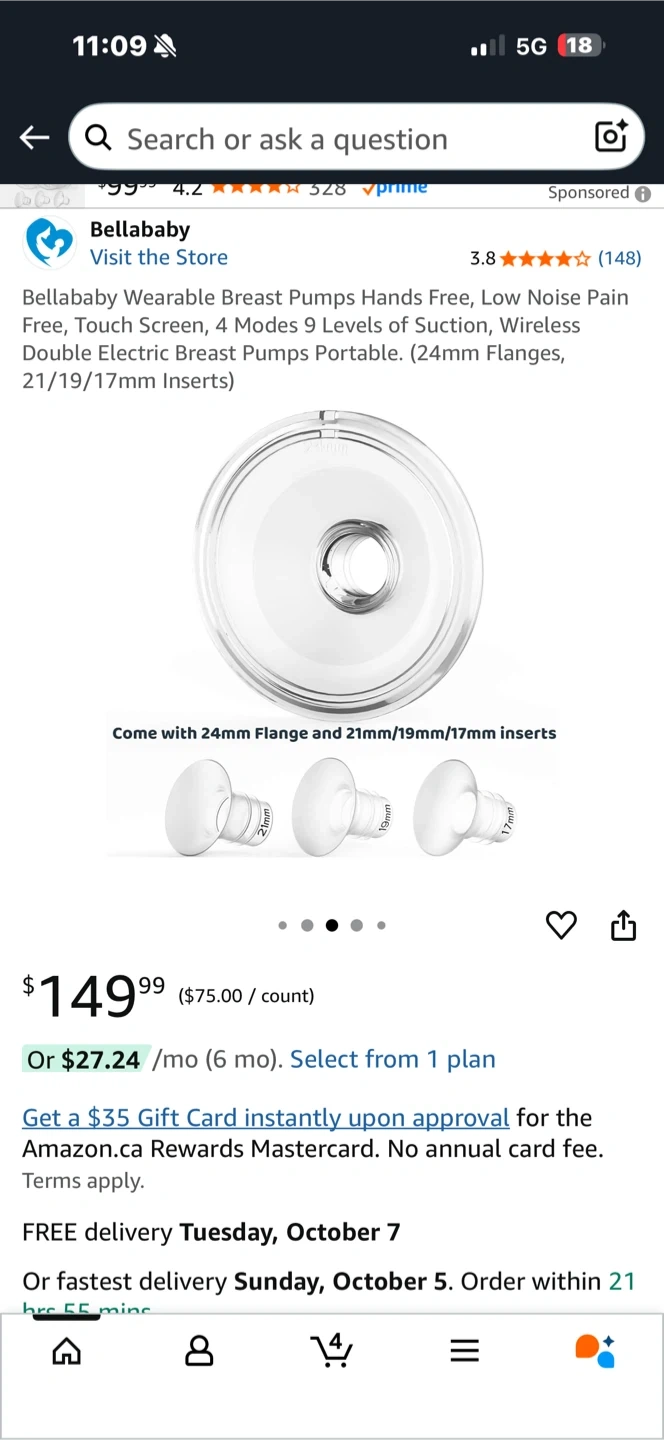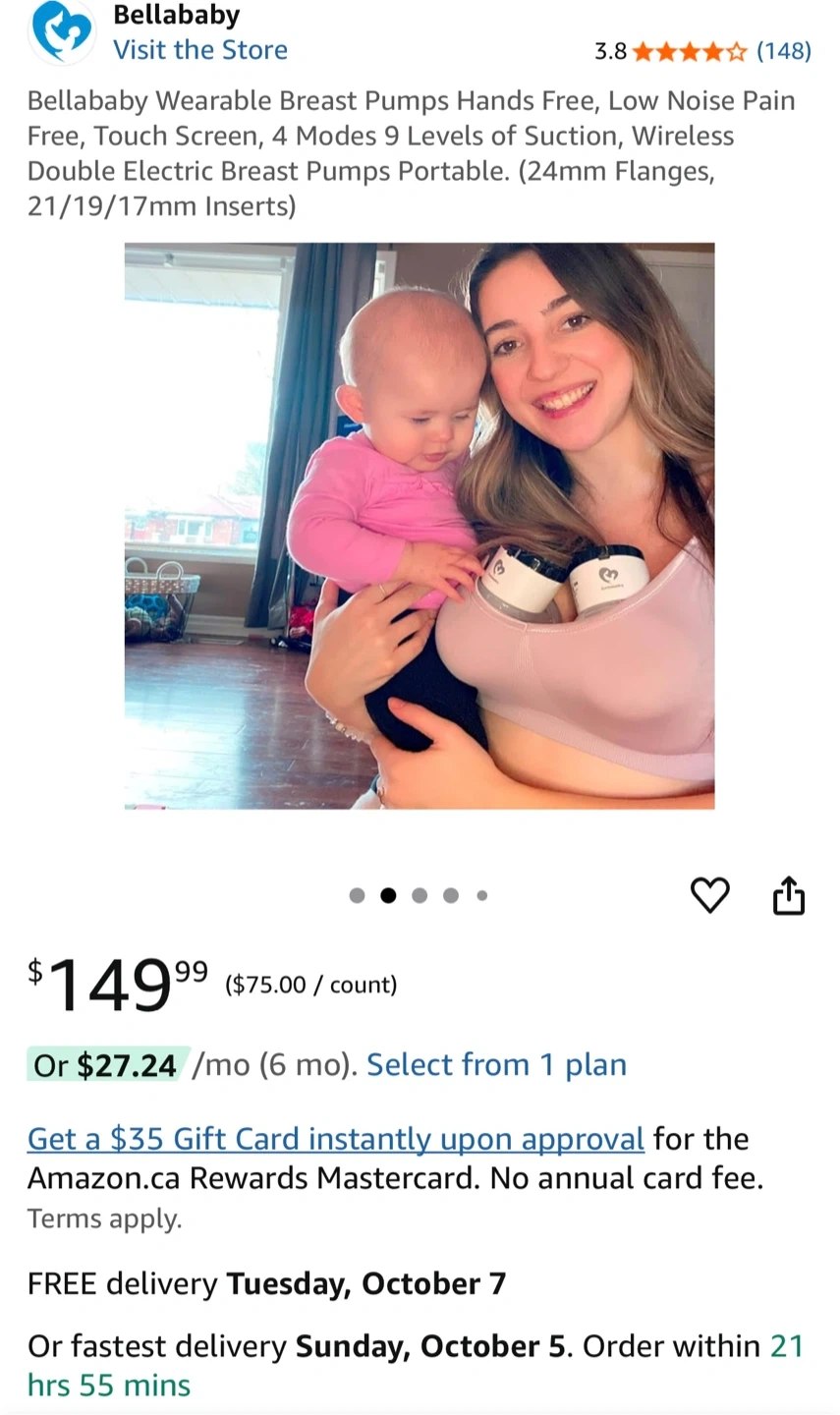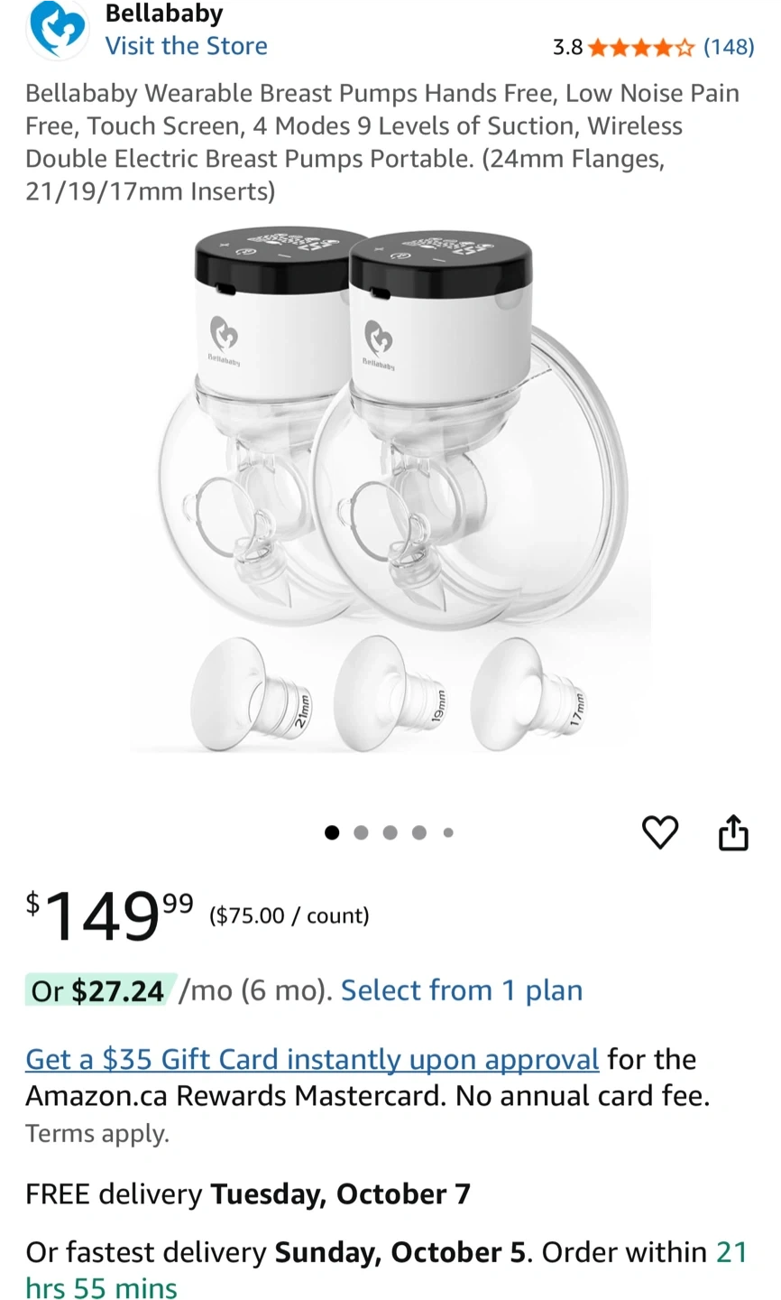 New not usedSelling a Bellababy Wearable Breast Pump. It's hands-free and has a low noise design. It features a touch screen, 4 modes, and 9 levels of suction. It's wireless and portable, and comes with 24mm flanges and 21/19/17mm inserts. The box is included!
