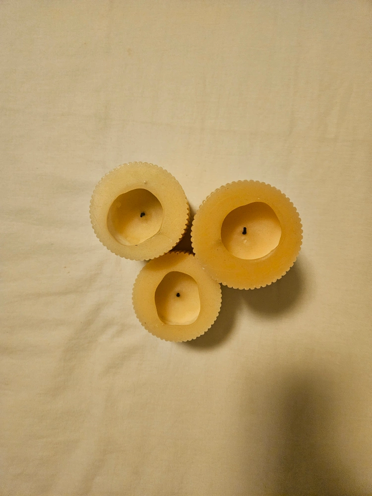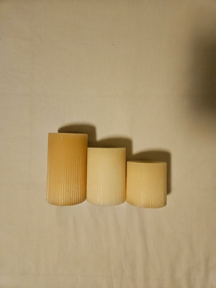 Selling a set of three cream-coloured pillar candles. They come in varying heights, adding a nice touch to any room. They have a ribbed texture. They are slightly burned already.
