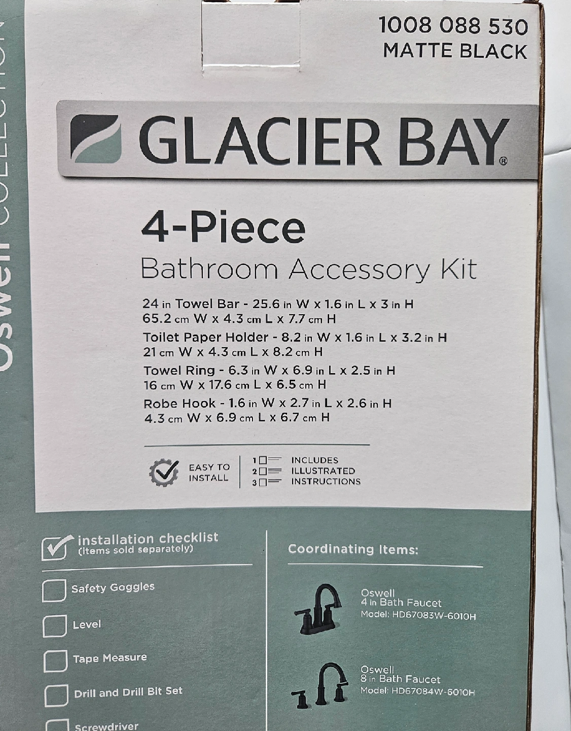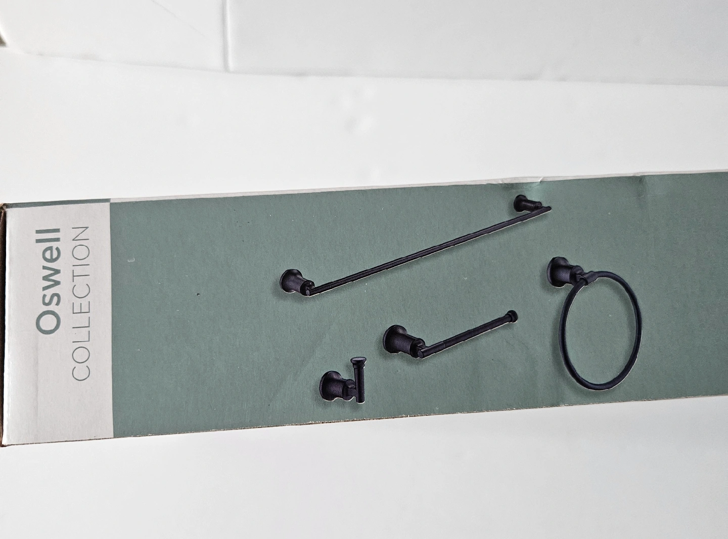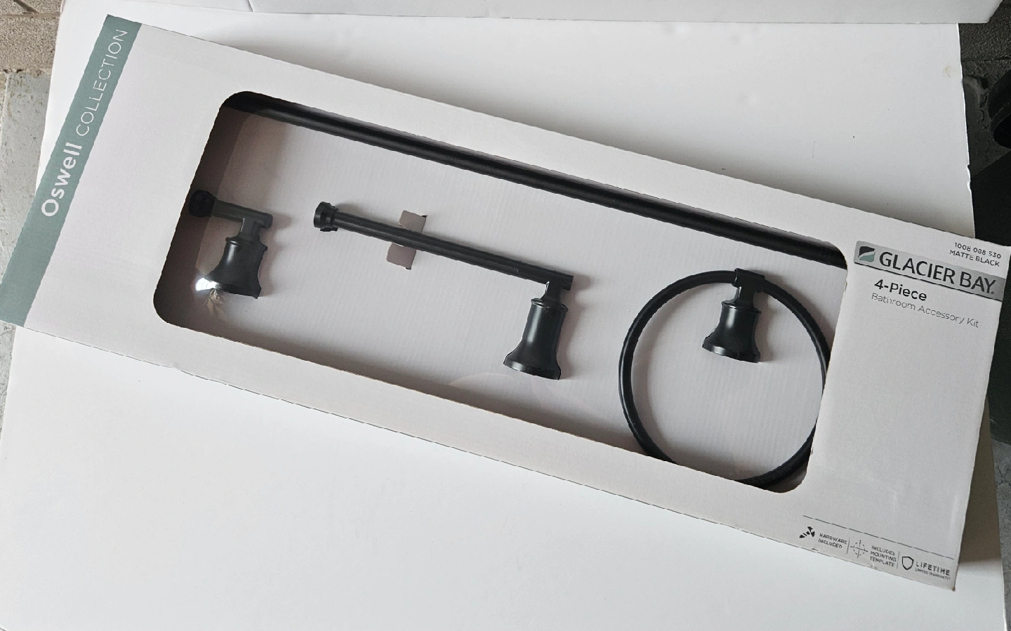 Selling a Glacier Bay Oswell Collection 4-piece bathroom accessory kit in matte black. It includes a towel bar, toilet paper holder, towel ring, and robe hook. All pieces are in the original box and ready to install!