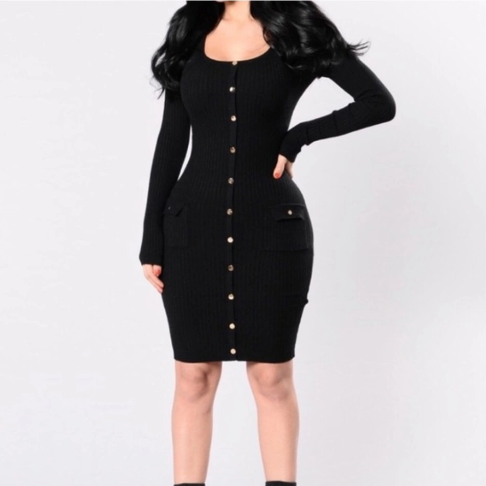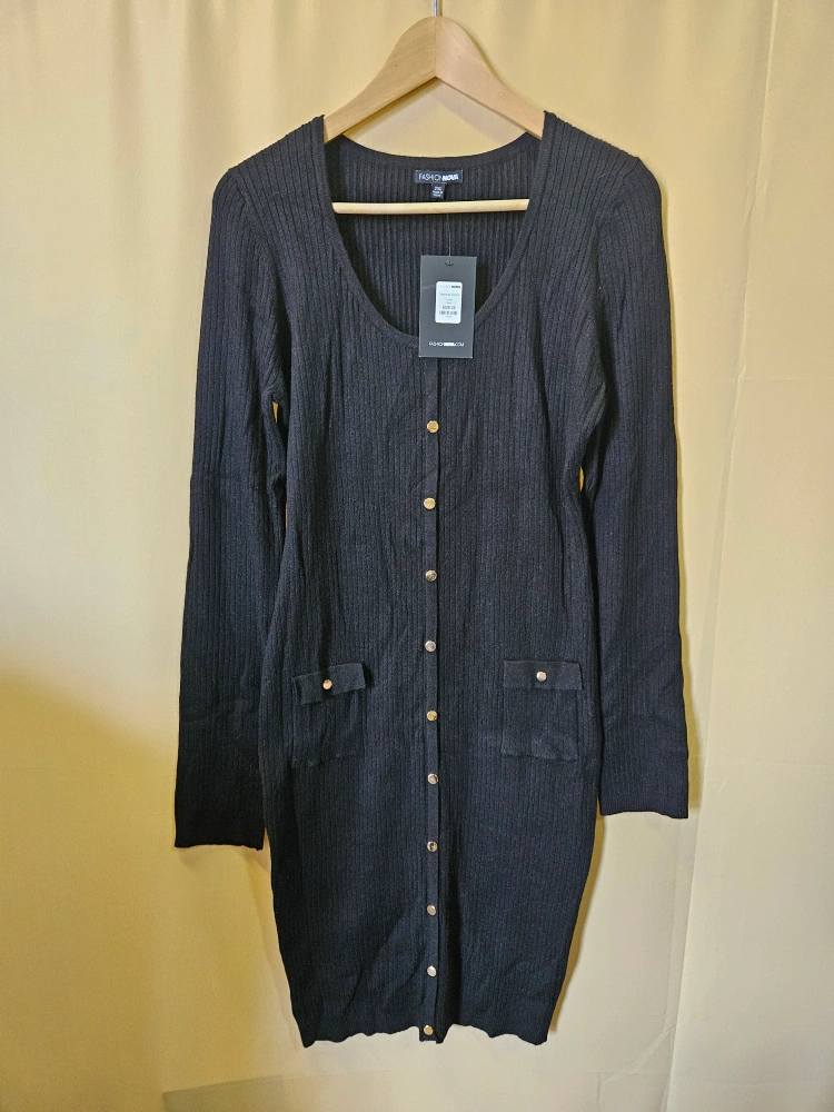 Selling a Fashion Nova black knit dress in size 2x! new with tag. The dress features long sleeves and gold buttons down the front.
