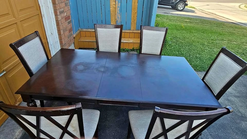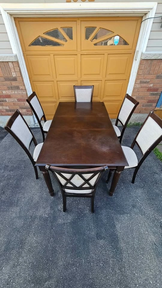 Selling wooden dining set with 6 chairs. Table can be adjusted to 2 sizes by taking out the mid section. Size 1- 71 inches Width , 40 inches depth and 30 inches height Size 2- 55 inches Width, 40 inches depth and 30 inches height. Construction is good and its long lasting. Can easily be taken apart and transported.