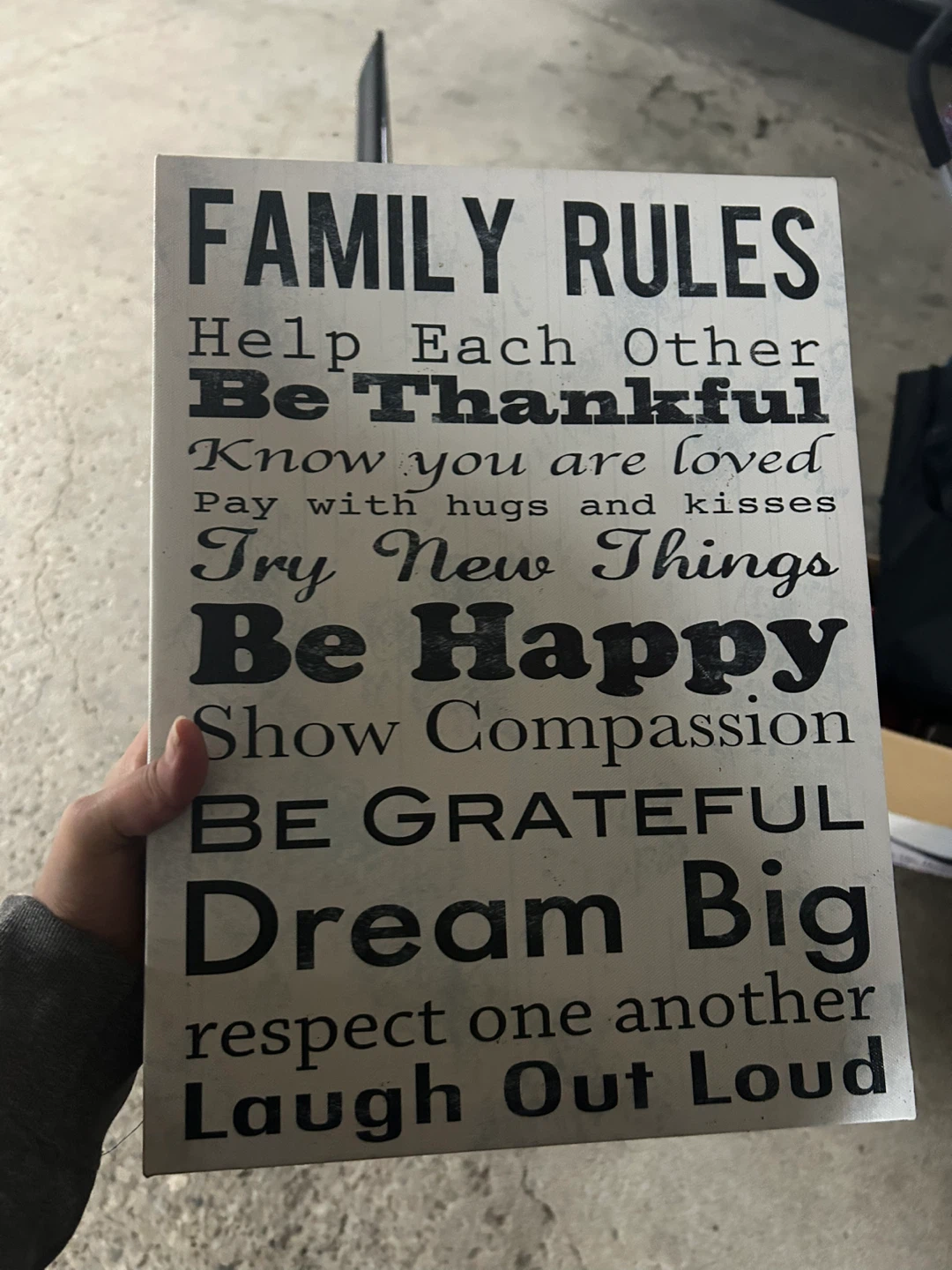 Wall decor with 'Family Rules' theme. Features various family-oriented sayings in a decorative font. Perfect for adding a warm touch to any home!