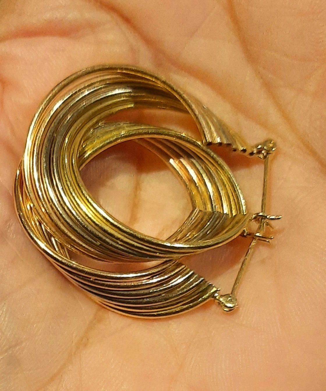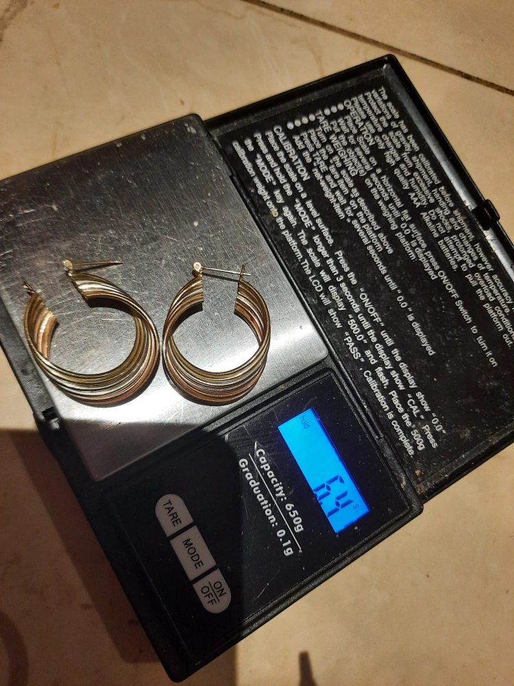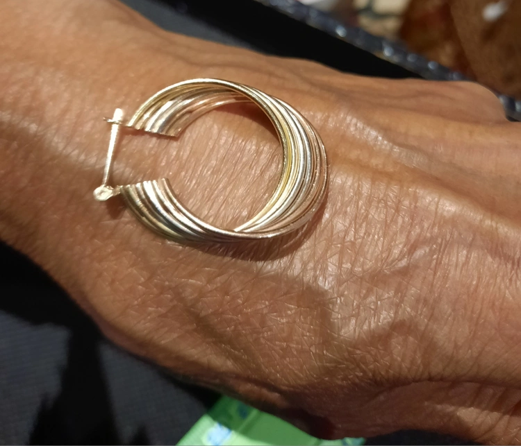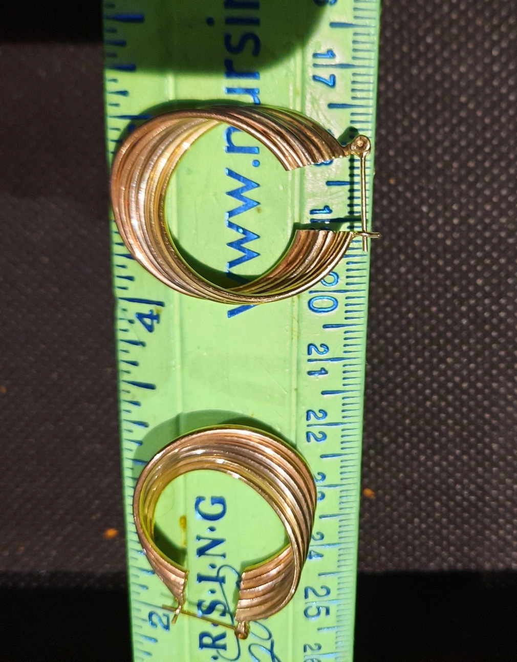 Selling a pair of SOLID GENUINE 14K gold hoop earrings! Yellow White and Rose Gold. Excellent condition and are about 1.5 inches. Large and in charge!